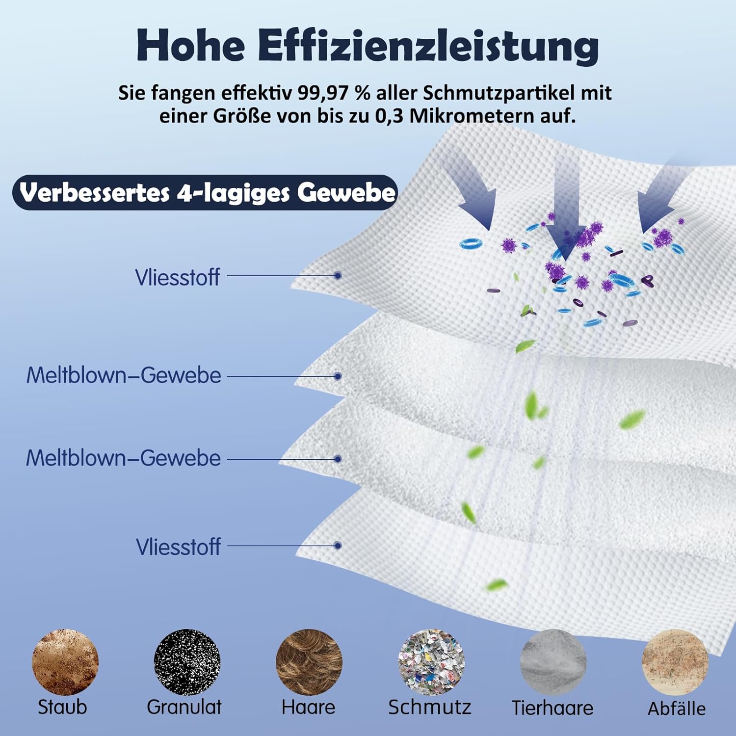 - Hocheffiziente Filtration: Unsere Staubbeutel bestehen aus einem 2-lagigen, superfeinen schmelzgeblasenen Faserfilter und einem 2-lagigen, präzisen Vliesstoff, der effektiv über 99,9 % Staub, 0,3 Mikron Partikel und anderen Schmutz blockiert.