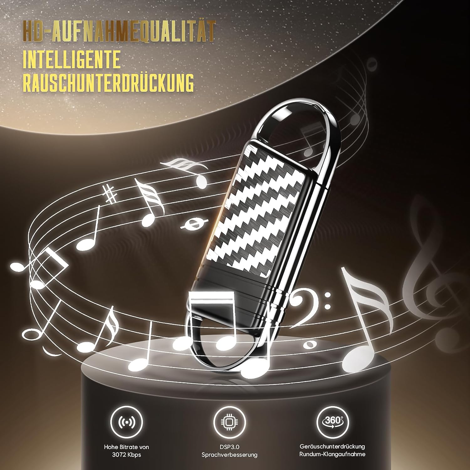 - 【Adaptiver HD-Rauschunterdrückungs-Chip für klaren Sound】 Das Herzstück des professionellen Aufnahmegeräts bildet ein moderner DSP 3.0 HD-Rauschunterdrückungs-Chip. Dieser analysiert das Audiosignal in Echtzeit und reduziert intelligently