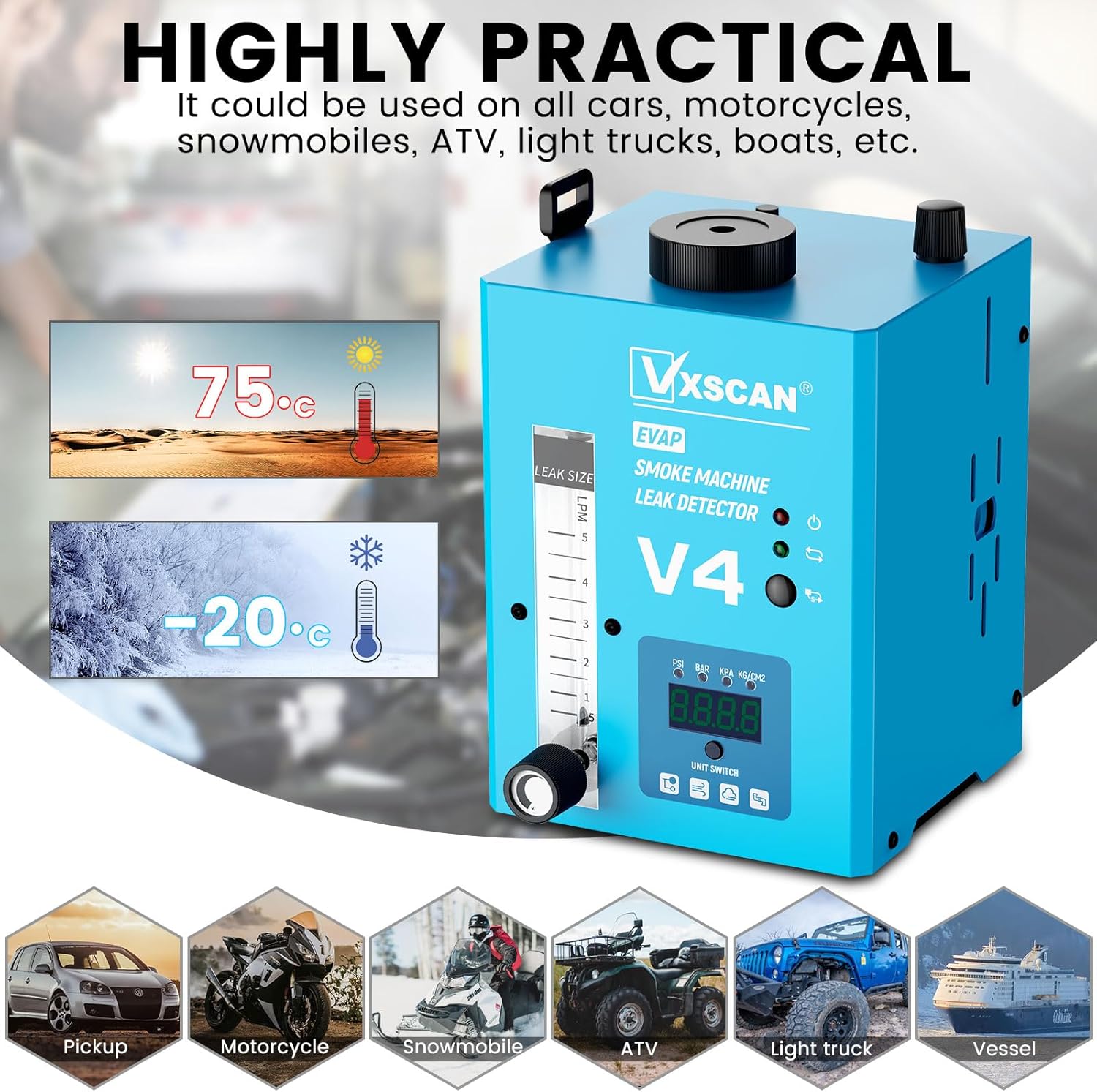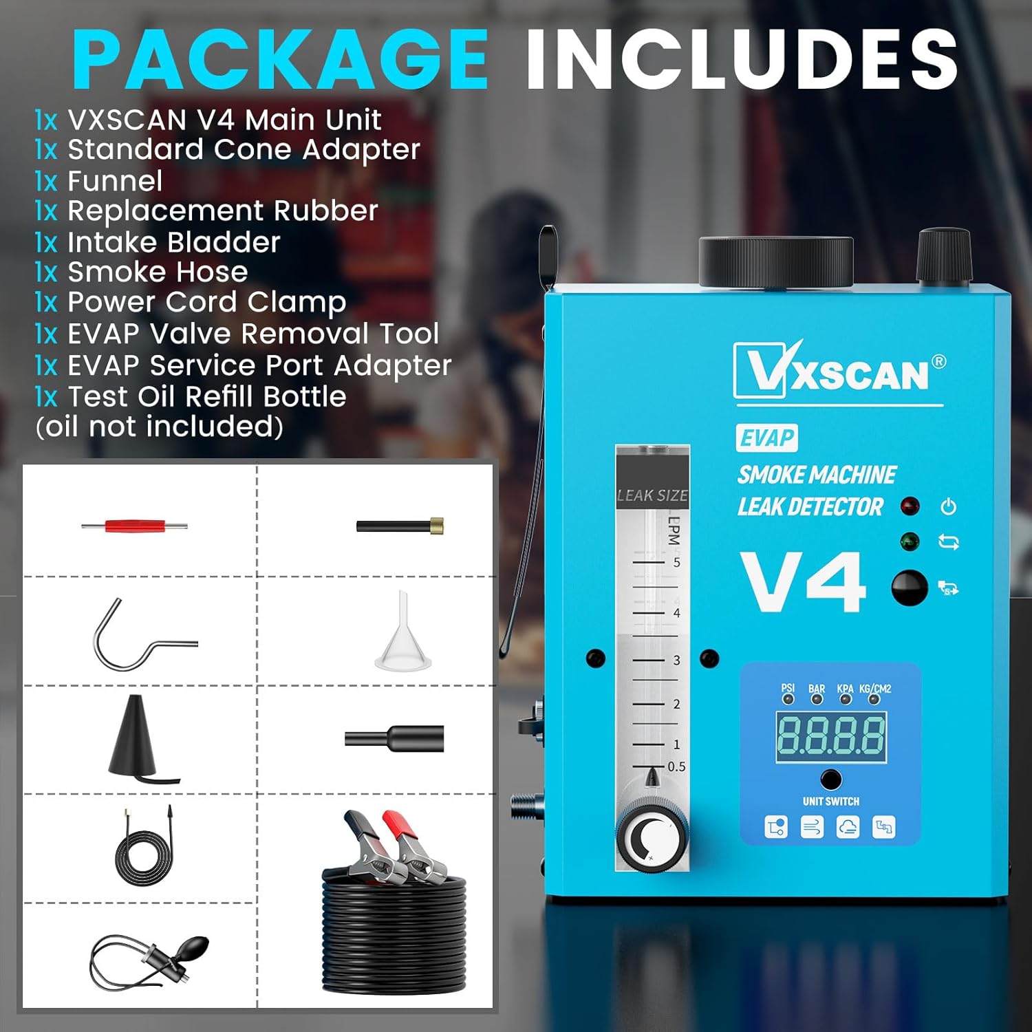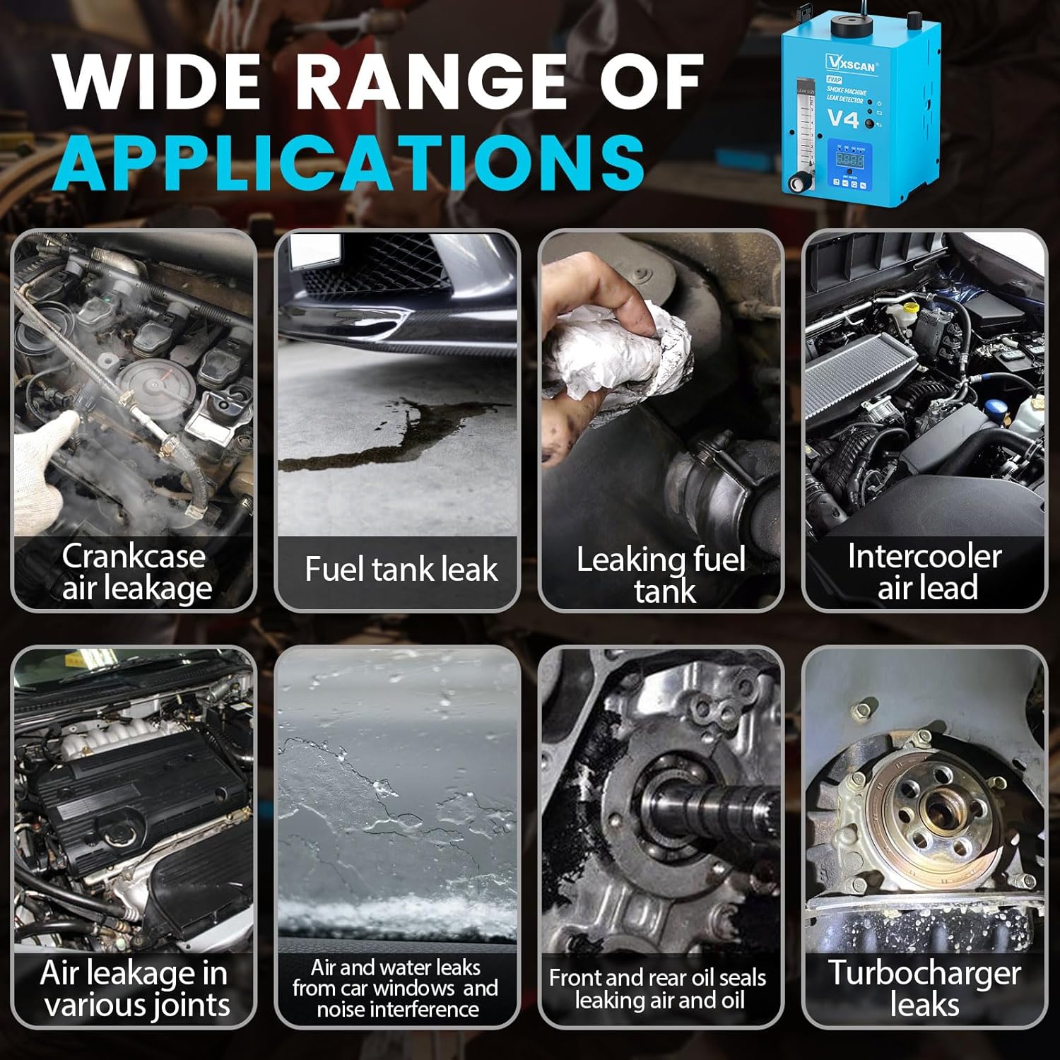 - 【VXSCAN V4 Nebelmaschine KFZ】 Kann Kfz-Dichtungen, Drosselklappenwellen, Motorblöcke, Turbolader-Testsysteme, Ansaugsysteme, Auspuffsysteme, Kraftstofftanksysteme, EVAP-Systeme, EGR-Systeme, Kühlsysteme und alle Arten von Rohrlecks überprüfen.
