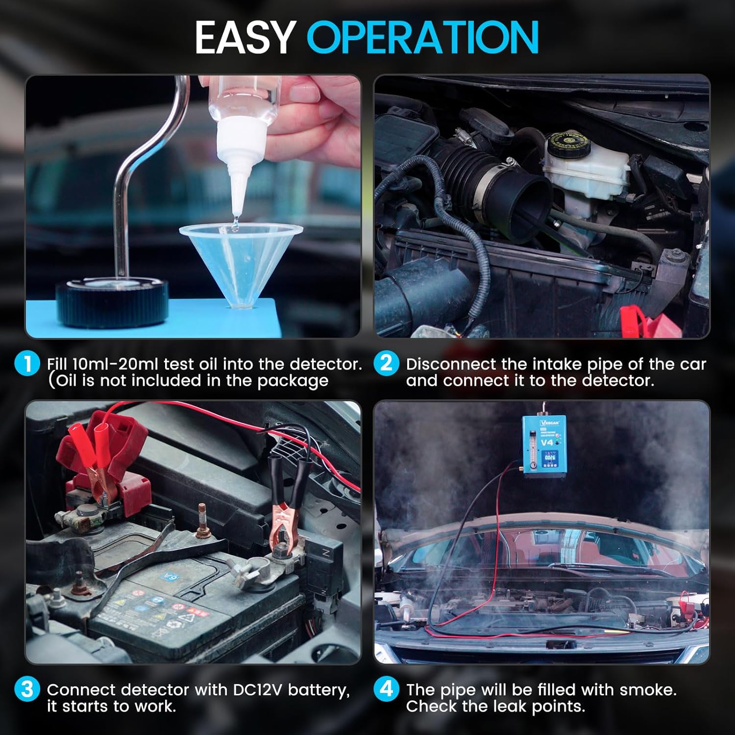 - 【Einfach zu Bedienen】 1.Füllen Sie den Detektor mit 10ml-20ml Prüföl (Pink Johnson's Baby Oil und Mineralöl können verwendet werden). 2.Trennen Sie das Auto Ansaugrohr und schliessen Sie es an den Detektor. 3.Schliessen Sie die nebelmaschine kfz