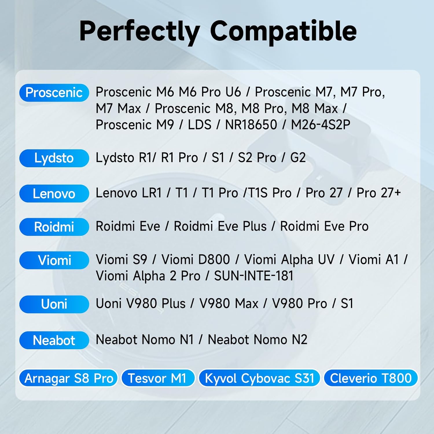 - 【Breite Kompatibilität】 Dieser Ersatzakku ist kompatibel für Proscenic LDS M7 Pro/M8 Pro/M7 Max/U6, Lenovo T1 Pro, Uoni V980 Max/ V980 Plus, Roidmi Eve Plus, für xiaomi Viomi S9,Kyvol Cybovac S31, Zoozee Z50, Neabot n1, Neabot n2, Tesvor m1