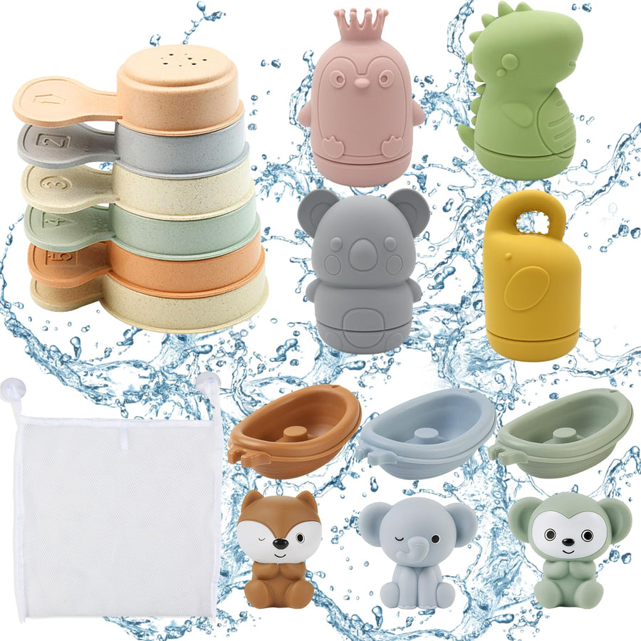 - 【16 Stück Badewannenspielzeug】Ausgestattet mit 3 verschiedenen Tierfingerspielzeugen, stapelbaren schwimmenden Booten in den entsprechenden Farben, 4 Spritztiere, 6 Badelöffeln unterschiedlicher Grösse und 1 Badespielzeugnetz. Bei der Verwendung