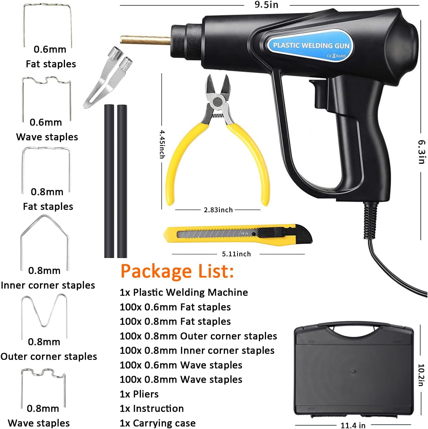 - 【Lieferumfang】 1 x Kunststoff-Schweissgerät, 100 x 0,8 mm lineare Wellen-Heftklammern, 100 x 0,6 mm lineare Wellen-Heftklammern, 200 x 0,8 mm grosse Wellen-Heftklammern, 100 x 0,6 mm grosse Wellen-Heftklammern, 150 x 0,8 mm V-förmige