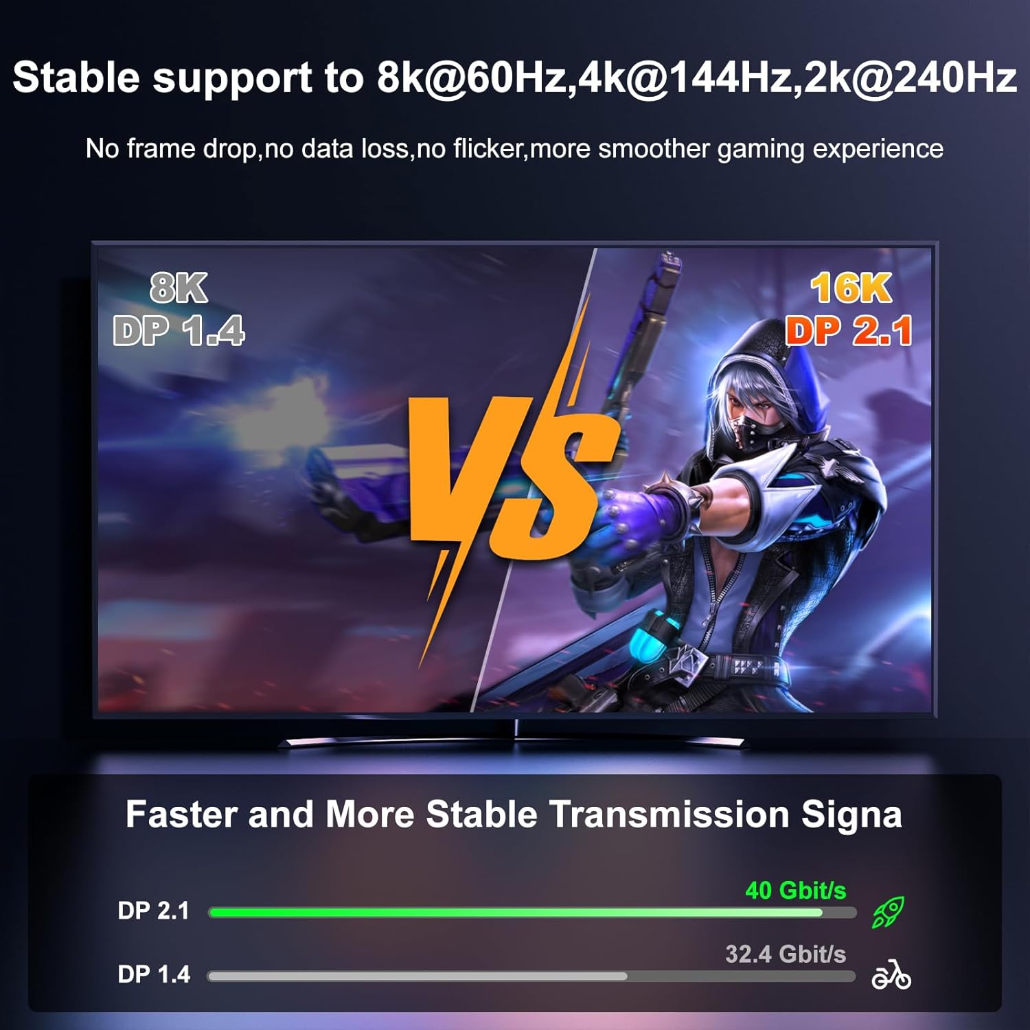 - Verbesserte Gaming-Erfahrung: Das DisplayPort 2.1 Kabel bietet eine höhere Bandbreite, HBR3 unterstützt 40 Gbps Bandbreite; Hohe Bildwiederholrate und hohe Auflösung, Maximieren Sie die Leistung Ihrer Grafikkarte und Monitor; Keine