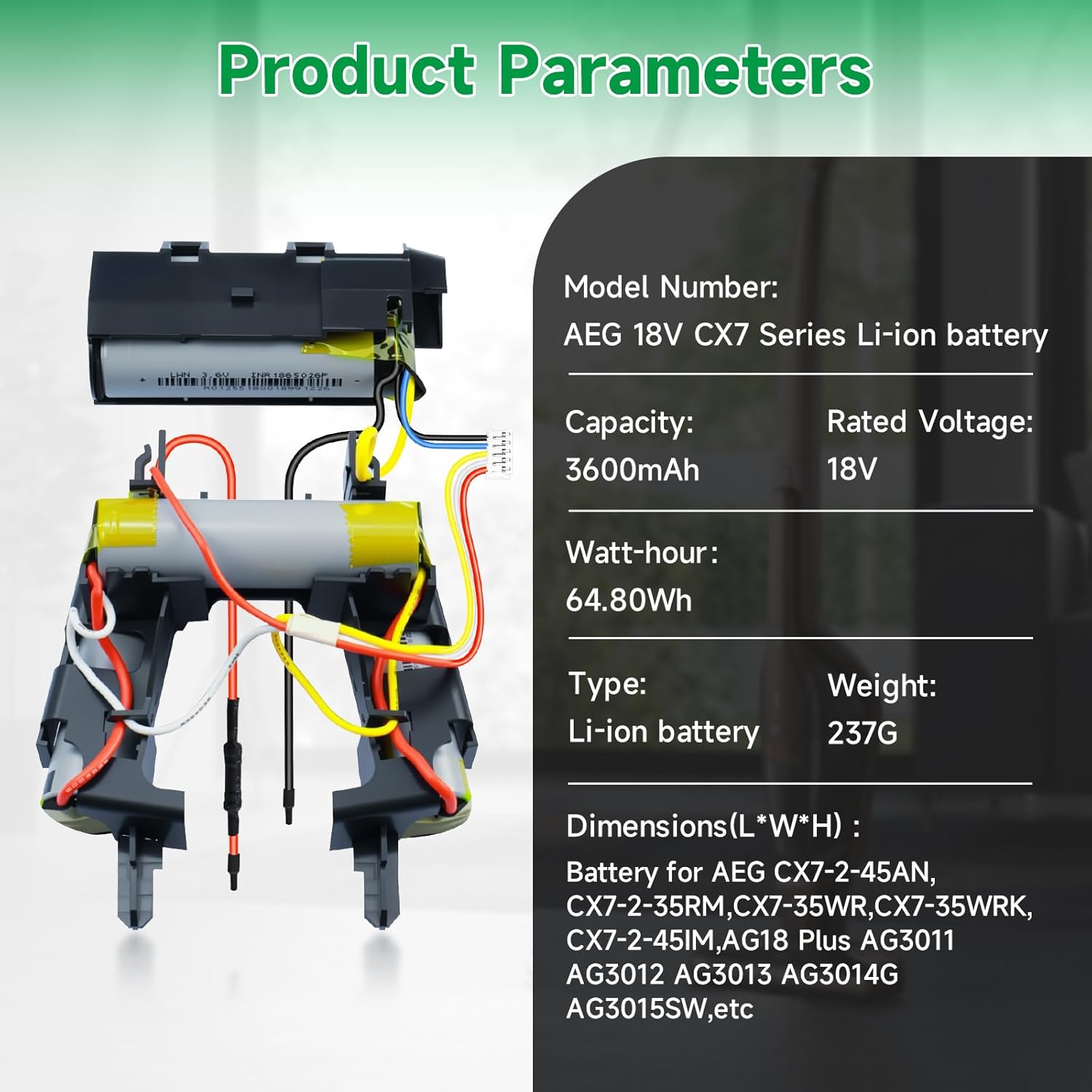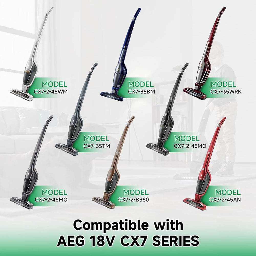 - Kompatibel für Electrolux 18V- und AEG 18V Akku, einschliesslich AEG CX7-2-45M Ö, CX7-2-45AN, CX7-2-45WM, CX7-2-45WR, CX7-2-35WR, CX7-2-35RM, CX7-35WR, CX7-35WRK, CX7-2-B360, AG18 Plus, AG35 Power, AG35X, AG3011, AG3012, AG3013, AG3014G, AG3015SW,