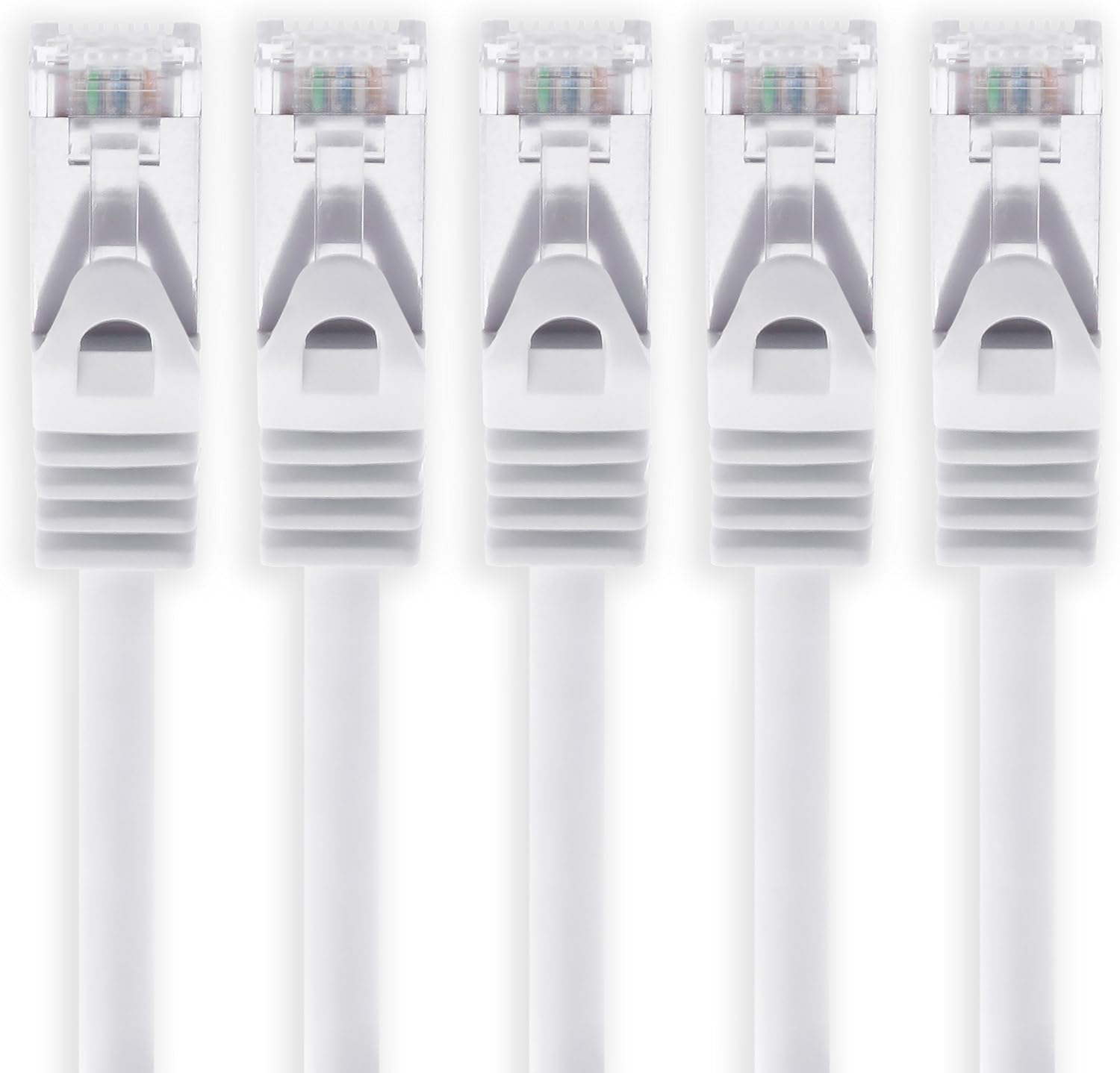 - weiss - 5 Stück - 10m - Cat.7 Marken - Netzwerkkabel (Rohkabel) mit 2 x RJ45 Stecker Cat6a - doppelt geschirmt PIMF (Paare in Metal Folie) und zusätzlich Metallgeflecht, Stecker mit Knickschutzhülle , vergoldete Kontakte