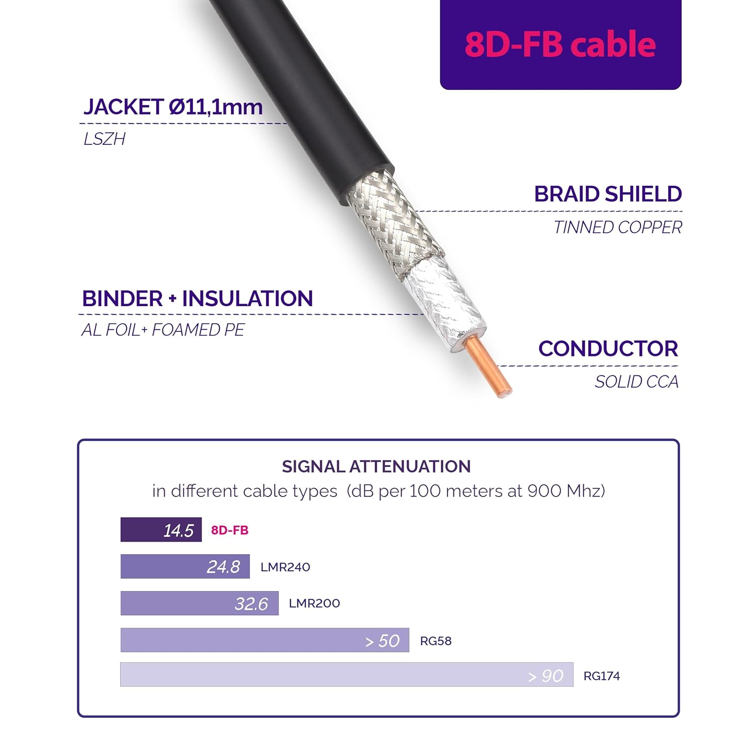 - âïžUltra Low Loss: Das 8D-FB-Koaxialkabel hat die gleiche Grösse wie das LMR400-Kabel, nĂ€mlich 11,1 mm im Durchmesser. Ein grösseres Kabel bedeutet einen viel grösseren Mittelleiter und unterstĂŒtzt eine bessere SignalĂŒbertragung fĂŒr HF/VHF/UHF
