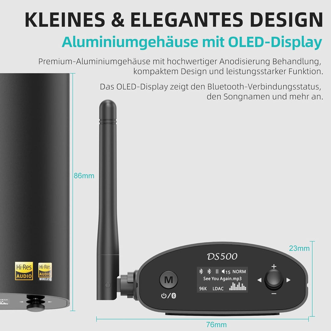 - Digitaler Klang in Audioqualität: Bluetooth 5.1 und audiophile DAC-Chips. DS500 Bluetooth-Empfänger verfügt über Qualcomm QCC5125 Bluetooth-Chip und ES9018K2M Chip, liefert stabile Bluetooth-Verbindung und ein Leistungsniveau, das die