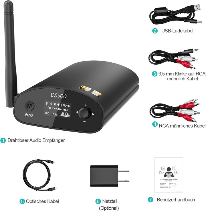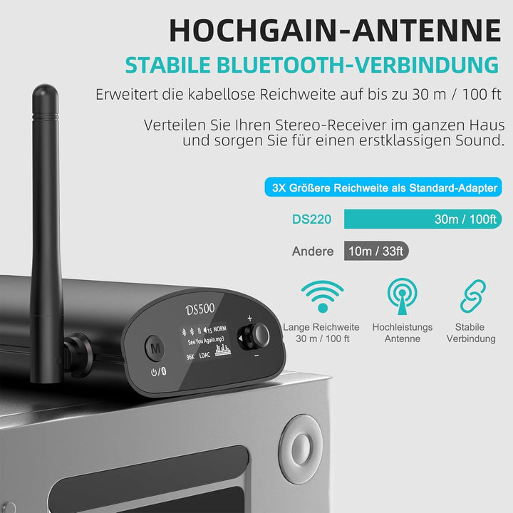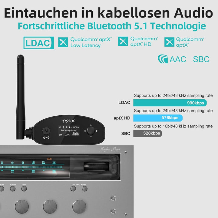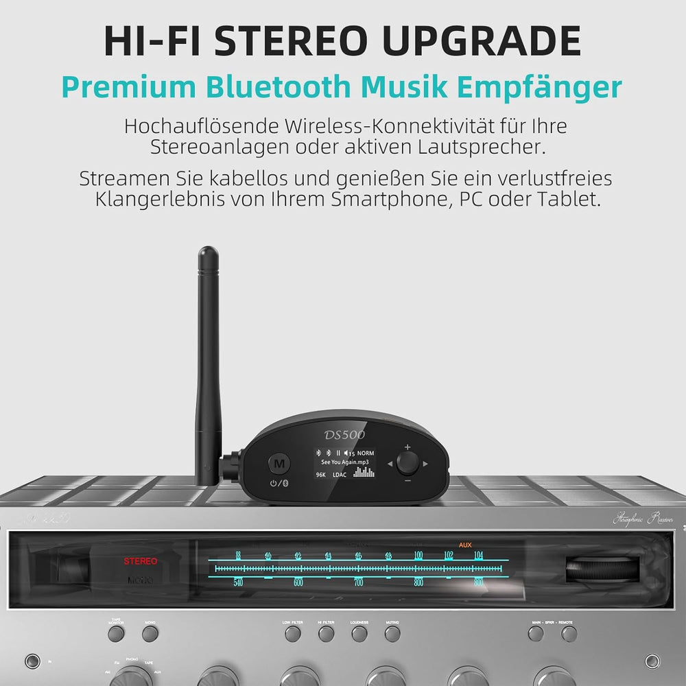 - Verbessern Sie Ihre Heimstereoanlage: DS500 ist ein audiophiler Premium-HiFi-Bluetooth-Audio-Adapter, der jedem Vintage-Heimstereo, AV-Receiver oder angetriebenen Lautsprechern eine hochauflösende Bluetooth-Konnektivität verleiht. Plug-and-Play, in