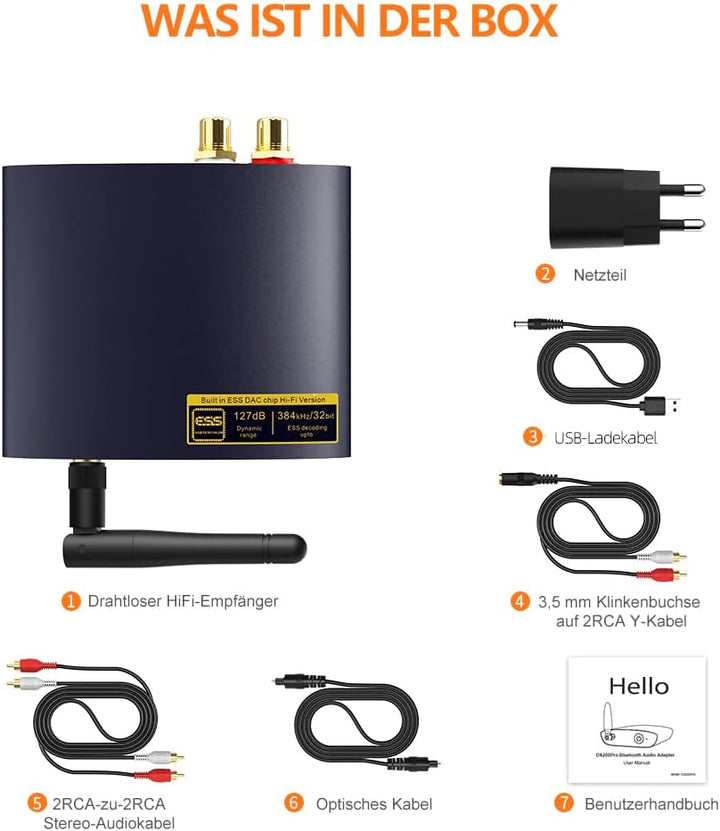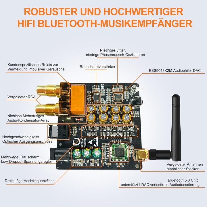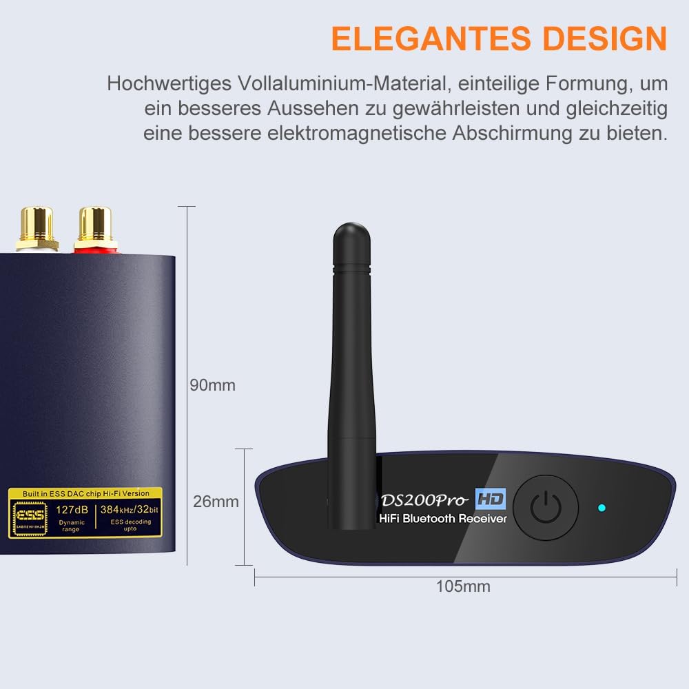- 【QUALCOMM Bluetooth 5.3】DS200 Pro Bluetooth-Empfänger für Heim-Stereoanlagen verfügt über einen Bluetooth 5.3 Chip, der eine Premium-Lösung ist, die hochwertige kabellose Audioleistung bietet und aptX, aptX LL, aptX HD, AAC Decodierung