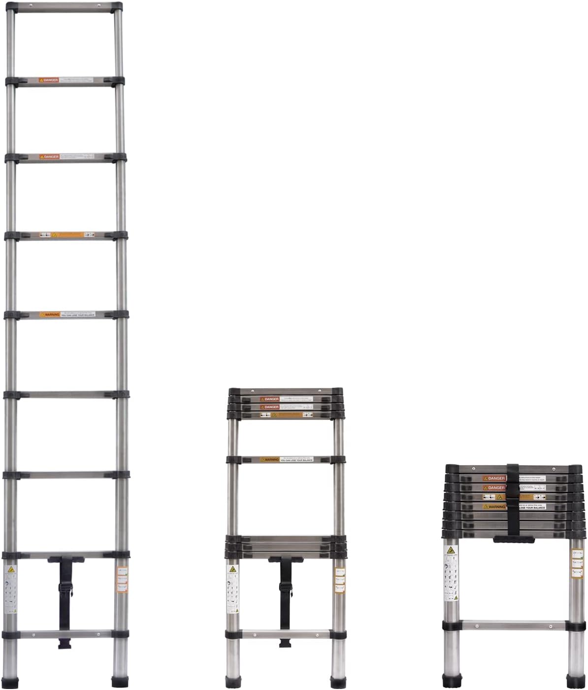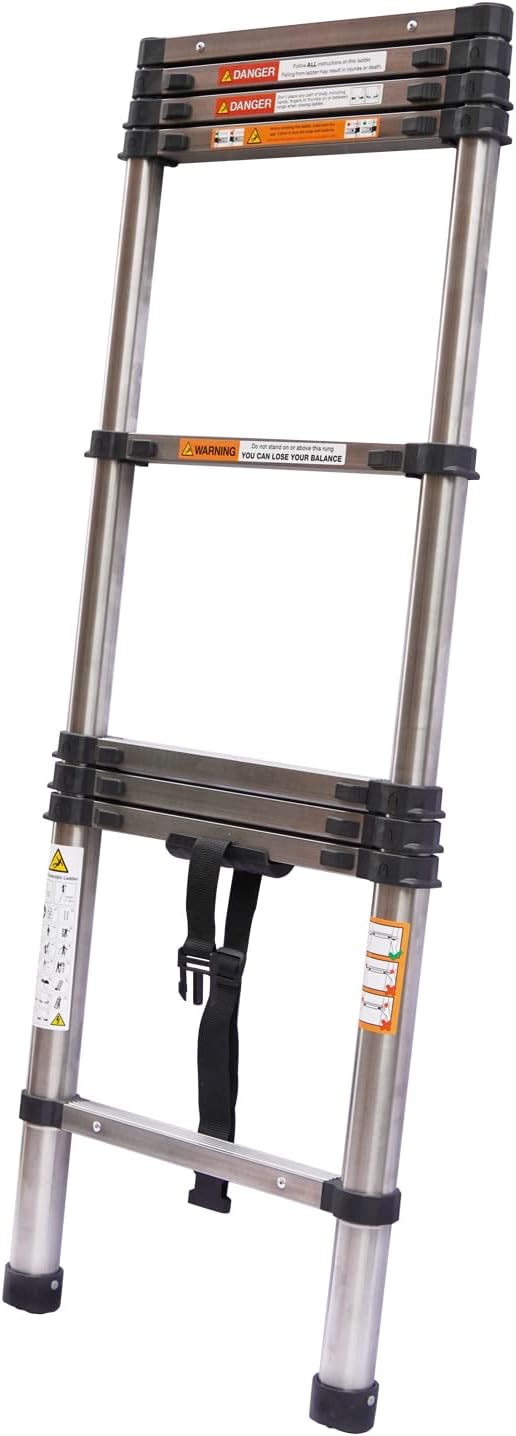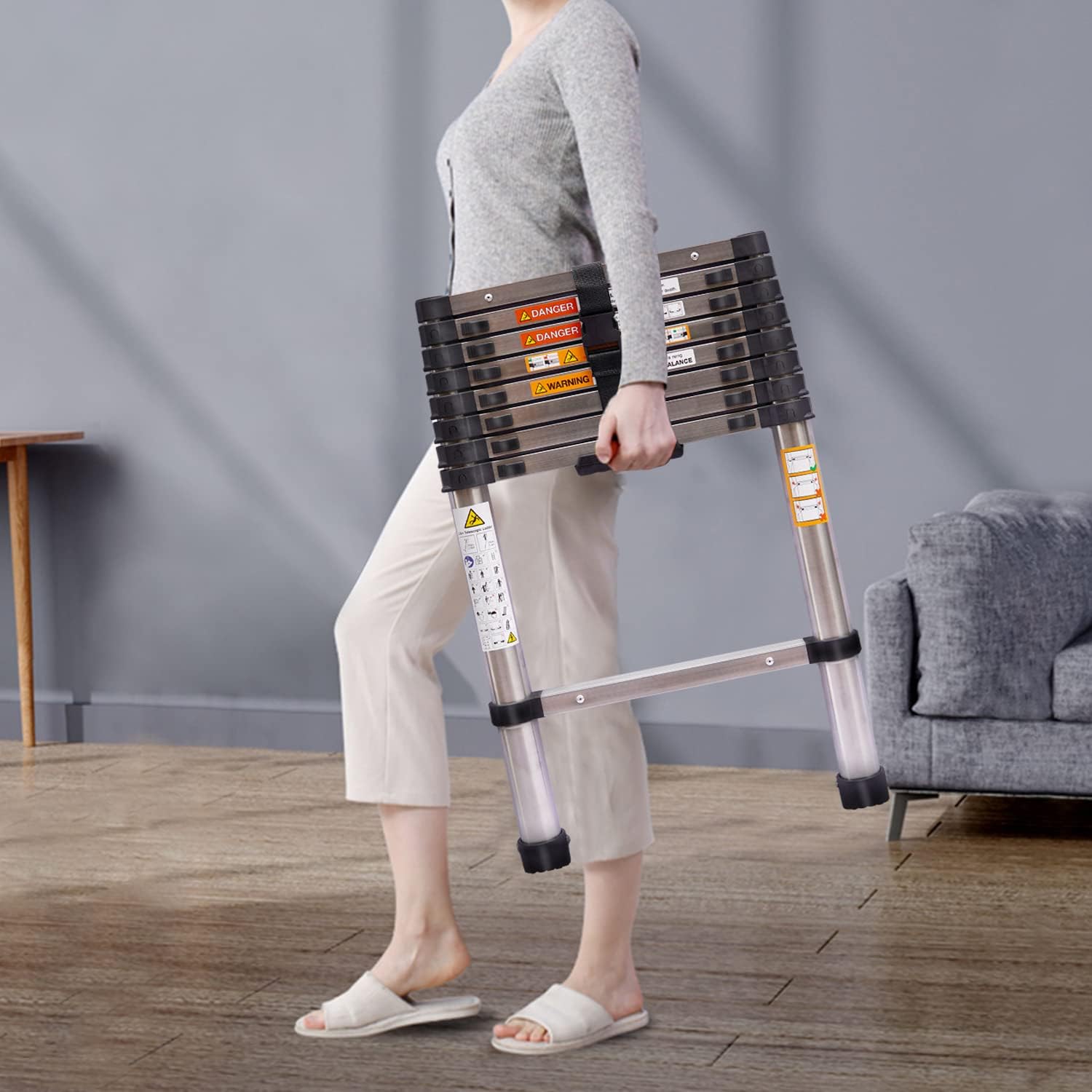 - Tragbar und praktisch: Kompakte und erweiterbare Grösse, einfach zu transportieren und zu lagern; Ein strapazierfähiger Verschlussgurt sichert die Leiter fest und ist leicht zu tragen.