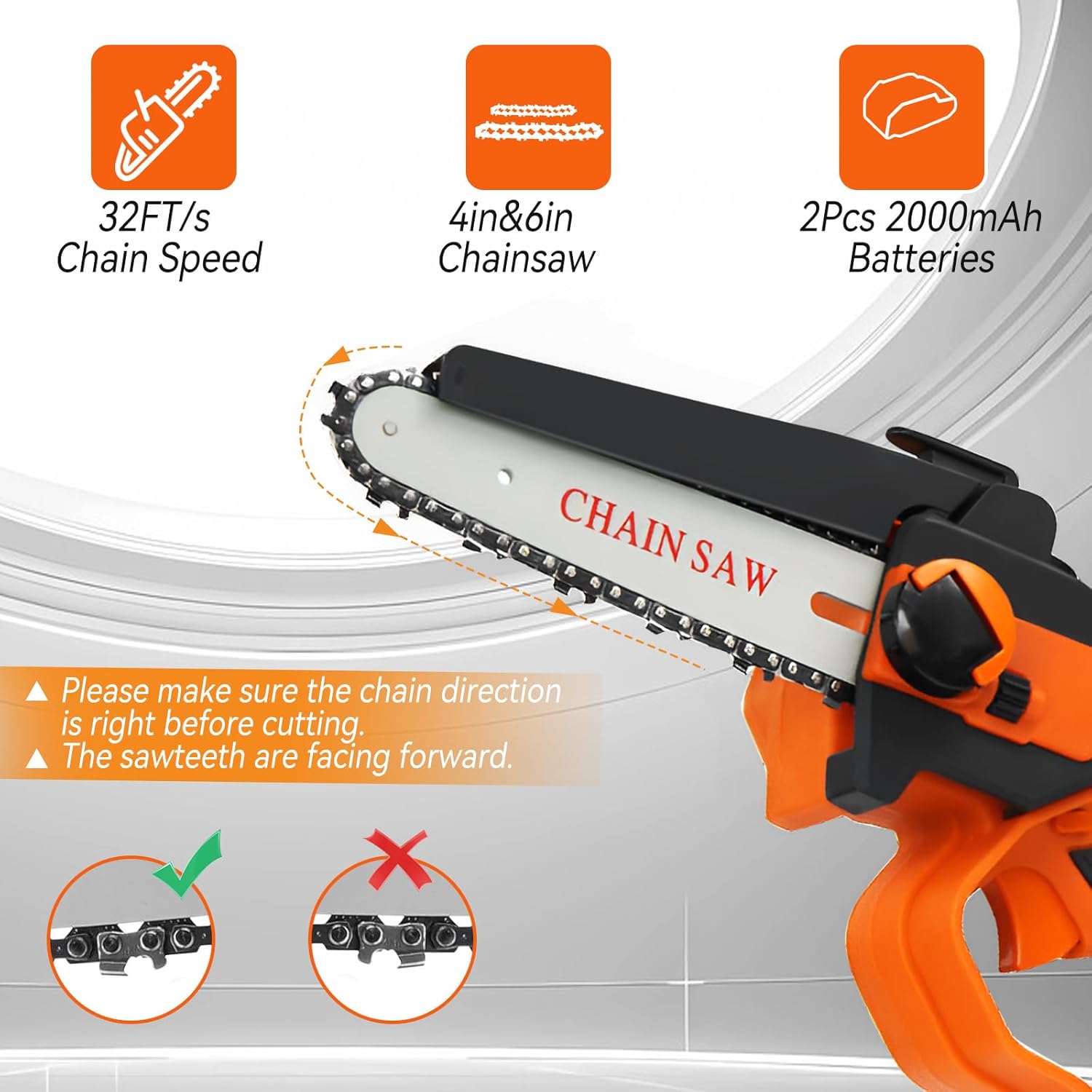 - Lieferumfang: elektrische Kettensäge x1, Verlängerungsstäbe x4, 21V Akku x2, 4Zoll Kette x2, 6Zoll Kette x2, 4Zoll Sägeblatt ×1, 6Zoll Sägeblatt ×1, Öldose x1, Handschuhe x2, Brille x1, Batterieladeadapter ×1, Aufbewahrungstasche x1,