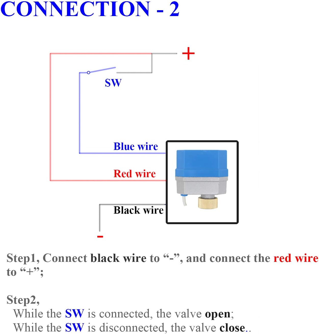 • Hinweis: Wenn Sie die Drähte "-" und "+" in entgegengesetzter Richtung anschliessen, können Sie das Ventil nicht vollständig schliessen. Sie müssen herausfinden, was der "-" Draht und was der "+" Draht ist, also verbinden Sie den schwarzen Draht mit