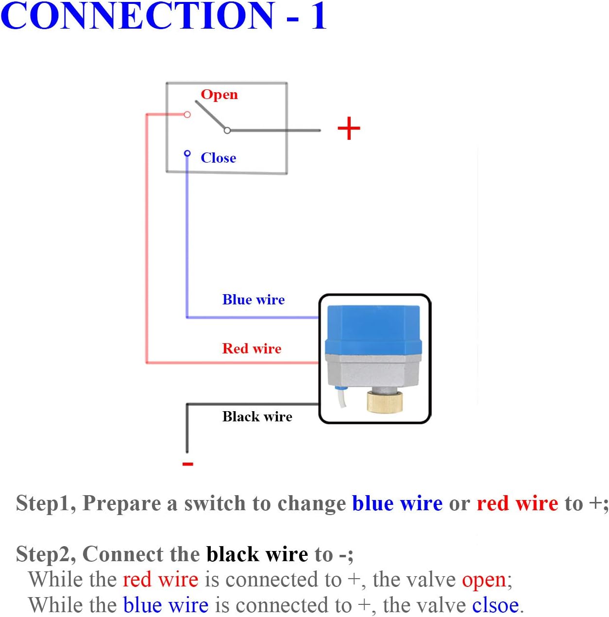 • Hinweis: Wenn Sie die Drähte "-" und "+" in entgegengesetzter Richtung anschliessen, können Sie das Ventil nicht vollständig schliessen. Sie müssen herausfinden, was der "-" Draht und was der "+" Draht ist, also verbinden Sie den schwarzen Draht mit