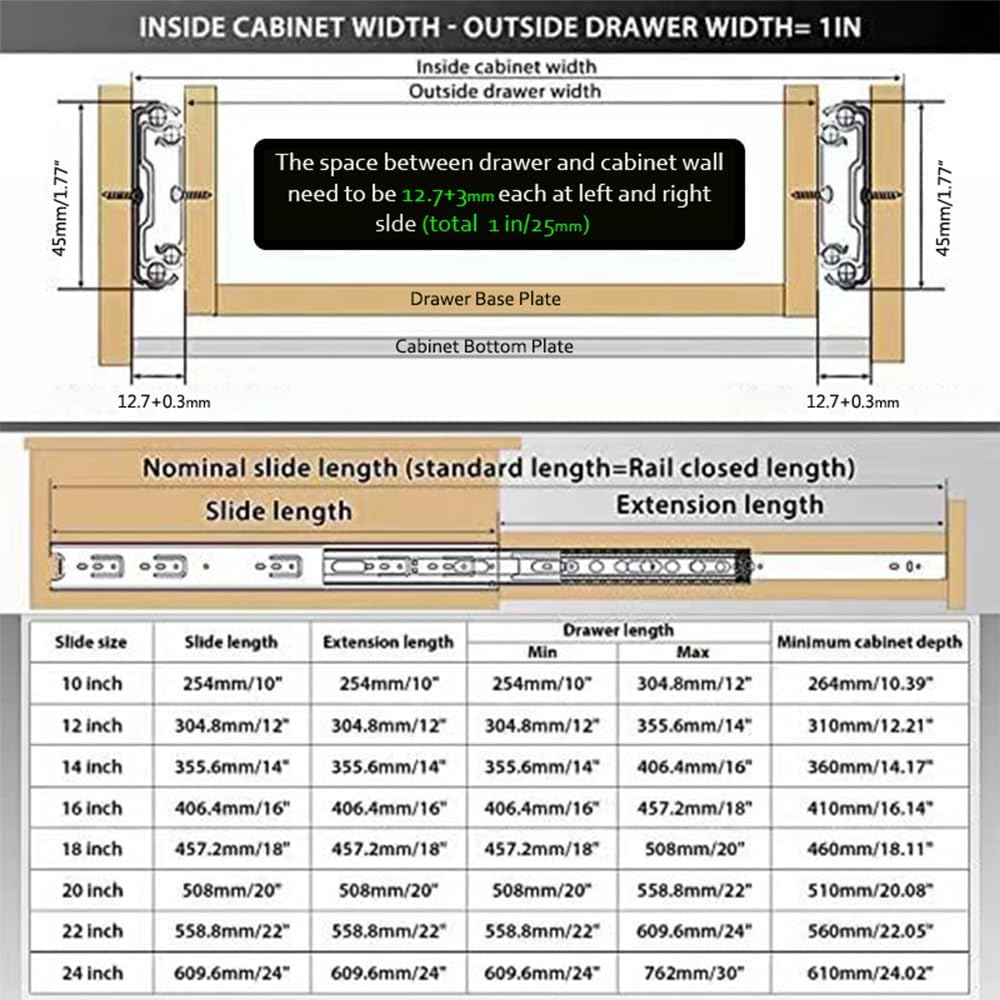 - Länge: 350 mm; Breite: 45 mm; Höhe: 12,7 mm; Tragkraft: 45 kg. Menge: 2-Sätze, kann für zwei Schubladen verwendet werden