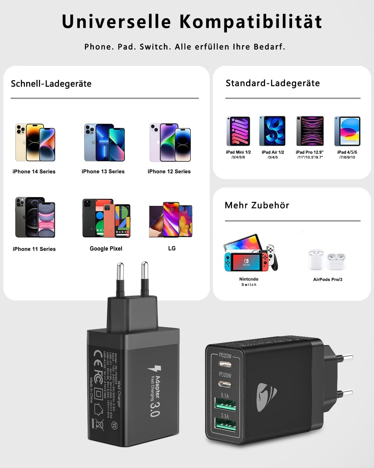 • ✔【2er Pack Mehrfach Ladegerät】:Das Power-Adapter ist mit einem 20W Dual-Port-USB-C und einem 15W Dual-Port-USB-Netzteil ausgestattet, mit denen bis zu 4 Geräte gleichzeitig aufgeladen werden können.Wenn Sie 2 Geräte schnell aufladen