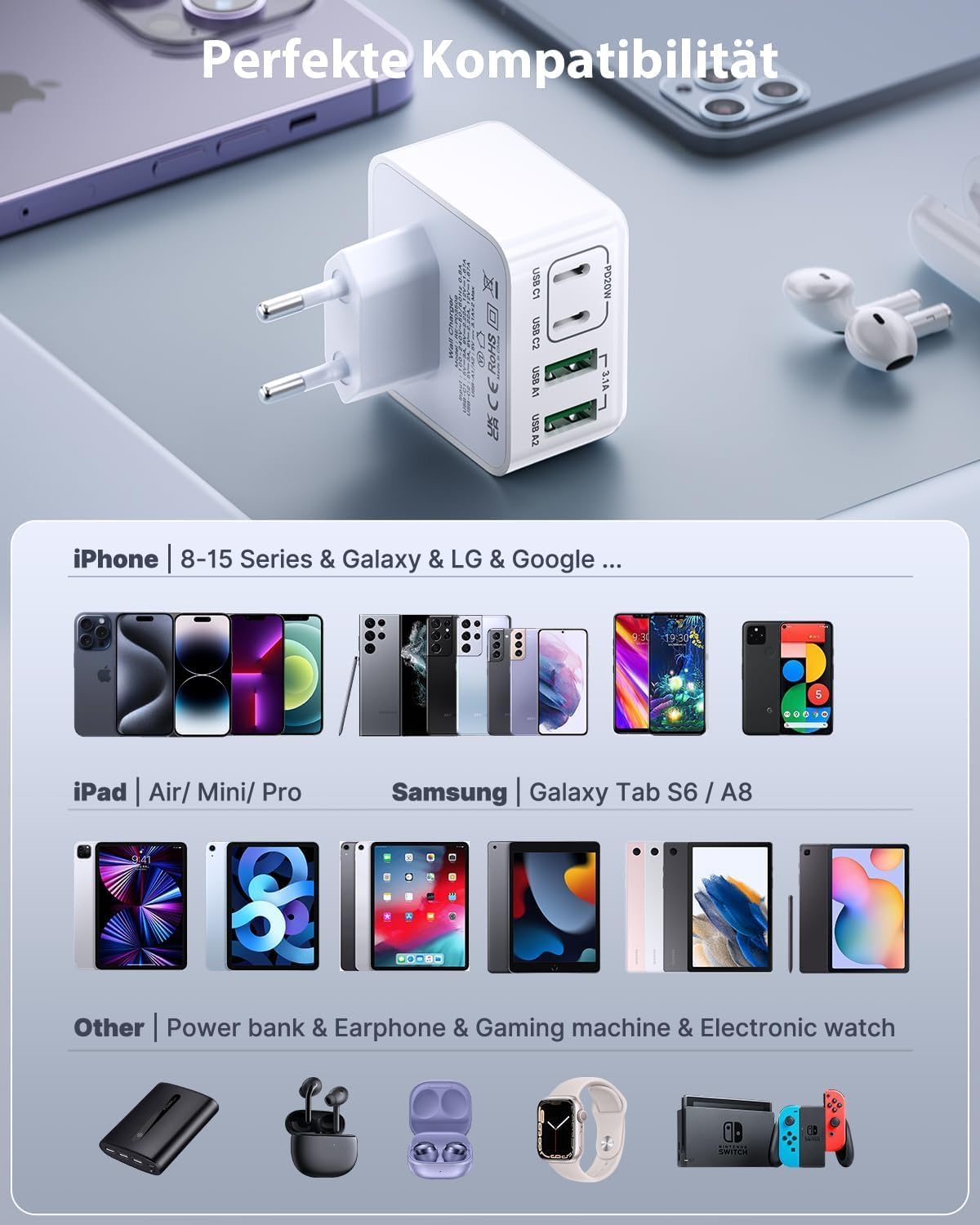 • 【Geeignet für mehrere Benutzer】 Ein USB C Netzteil kann bis zu vier Geräte gleichzeitig aufladen, was Wartezeiten minimiert und es Benutzern ermöglicht, ihre Telefone, Tablets und Kopfhörer gleichzeitig aufzuladen. Ausserdem muss das Multi USB C