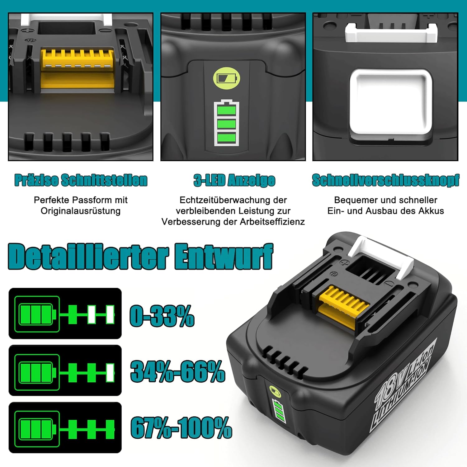 • 【Akku und Ladegerät】Batteriespannung: 18V | Kapazität: 5500 mAh | Typ: Li-Ion;Ladegerät Eingang: 100-240V | Ausgang: 14.4-18V | Ladestrom: 6A | Automatische Spannungsregelung, kann zwei 14.4V-18V Batterien gleichzeitig laden.