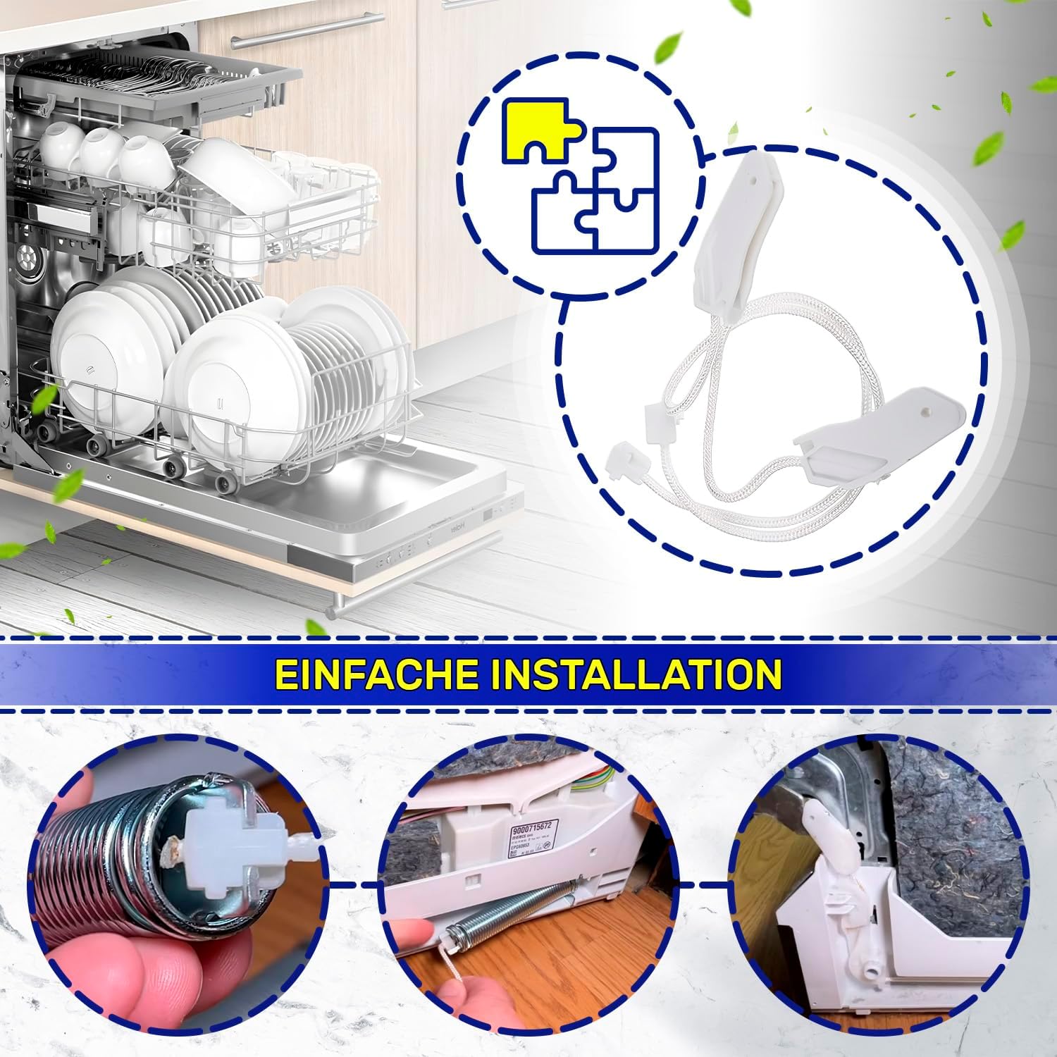 - EINFACHER EINBAU - Seitenwand des Geschirrspülers abnehmen, das Kabel an den Federmechanismus anschliessen und das andere Ende an der Tür befestigen. Prüfen Sie nach dem Einbau, ob die Tür leichtgängig und zuverlässig funktioniert
