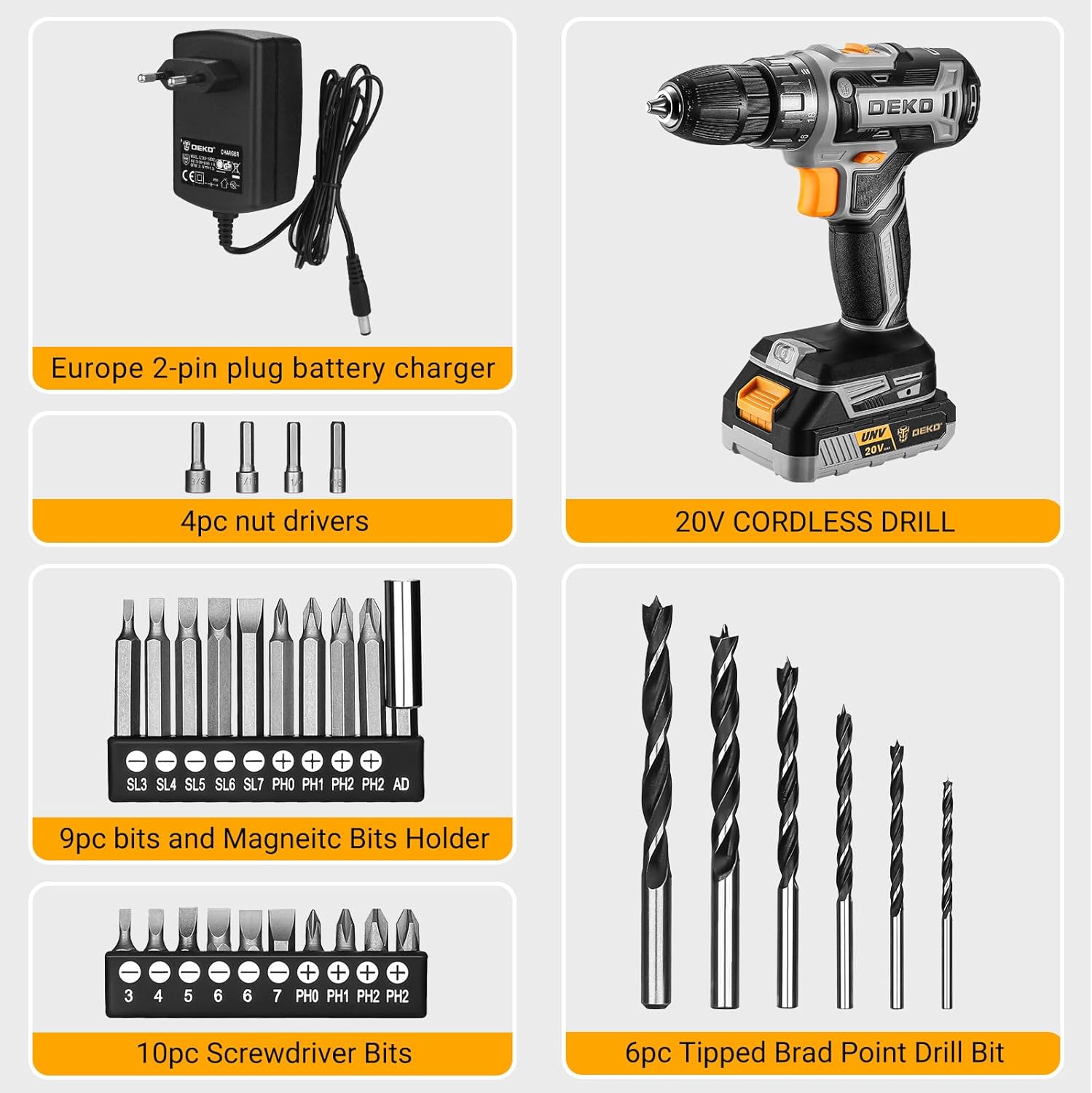 - 【Bohrer mit Bohrer】 Dieses Bohrer-Set beinhaltet 1 x 20 V Akku-Bohrer; 1 x 1,5 Ah Akku; 1 x Ladegerät; 10 x Bits (SL3-SL4-SL5-SL6-SL7-PHO-PH1-PH2-PH2); 1 x Magnet-Bithalter (60 mm); 10 x Schraubendreher-Bits; 6 x Spitze Bohrer; 4. * Steckschlüssel;