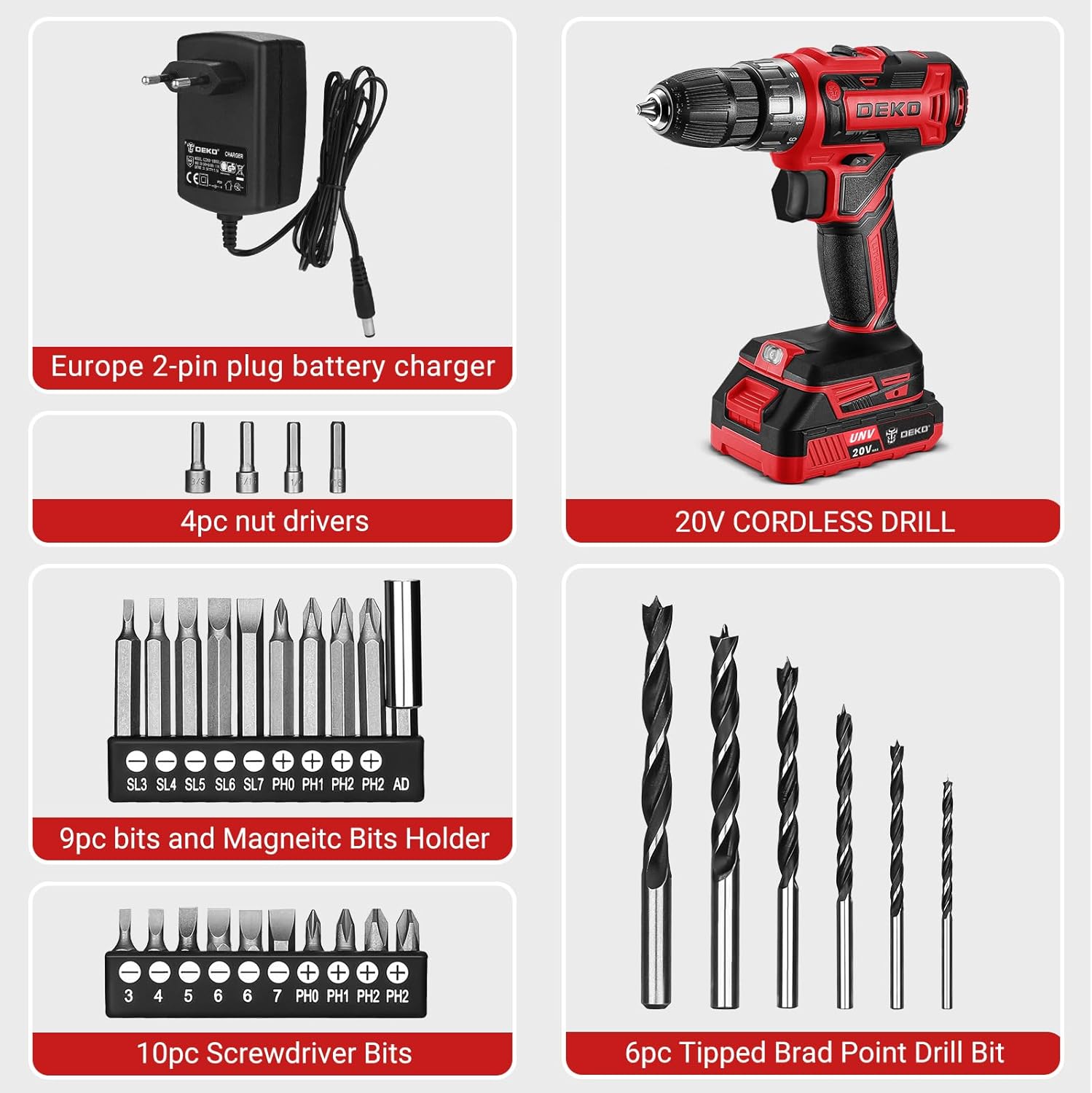 • [Roter Bohrer mit Bohrer] Das Bohrer-Set enthält einen schnurlosen Bohrer mit 1 x 20 V; 1 x 1,5 Ah Akku; 1 x Ladegerät; 10 Ziffern (sl3 - sl4 - sl5 - sl6 - sl7 - Pho - ph1 - ph2 - ph2); 1 x Magnetbohrhalterung. 60 mm. 10 x Schraubendreherkopf; x