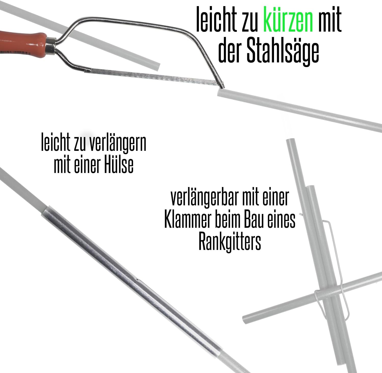 - MONTAGE: Die Klammern halten durch die eigene Spannung. Sie werden ohne Werkzeug montiert und können jederzeit wieder verändert werden. Wenn ein Stab verlängert werden soll, kann dies insoweit ganz einfach erfolgen, indem die Enden zweier Stäbe in