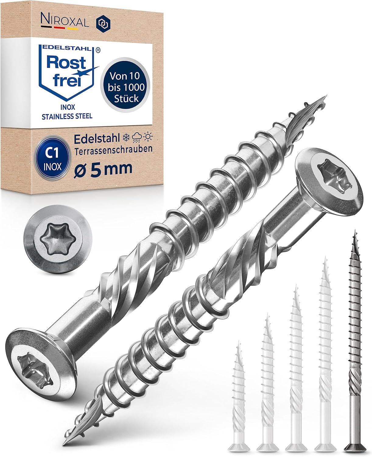 - PERFEKT für Esche, Lärche, Bangkirai, Douglaise, Bambus, Gerutu, Ipe, Lapacho, Iroko, Kambala, Kaput und Walaba. Schrauben für Terrassendielen mit der Werkstoffklasse C1 zeichnen sich durch ihre Langlebigkeit und sehr hohe Festigkeit aus. Die