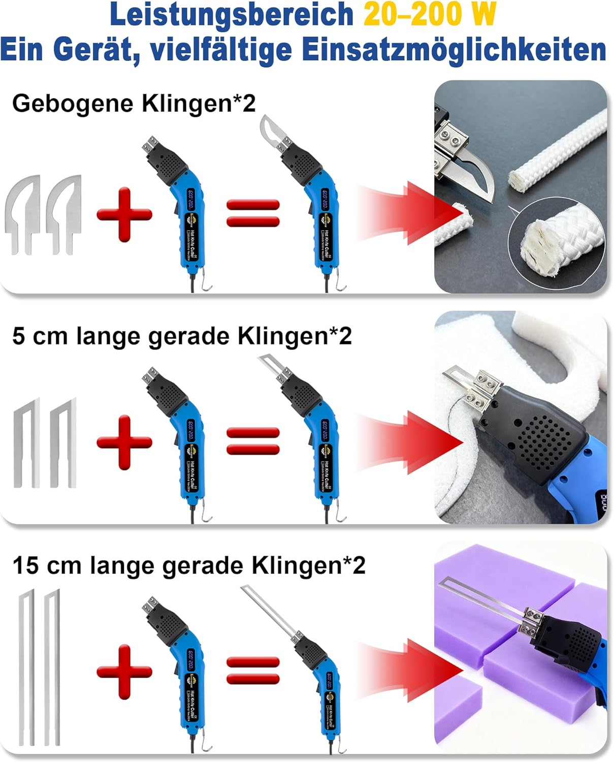 - đăProfessionelles Zubehöră Unser elektrischer Schaumstoffschneider ist mit 4 Nickel-Chrom-Klingen (20cmĂ2+15cmĂ2) ausgestattet, die eine gute WĂ€rmeleitfĂ€higkeit und Haltbarkeit haben, so dass Sie alle Arten von Schneiden leicht durchfĂŒhren