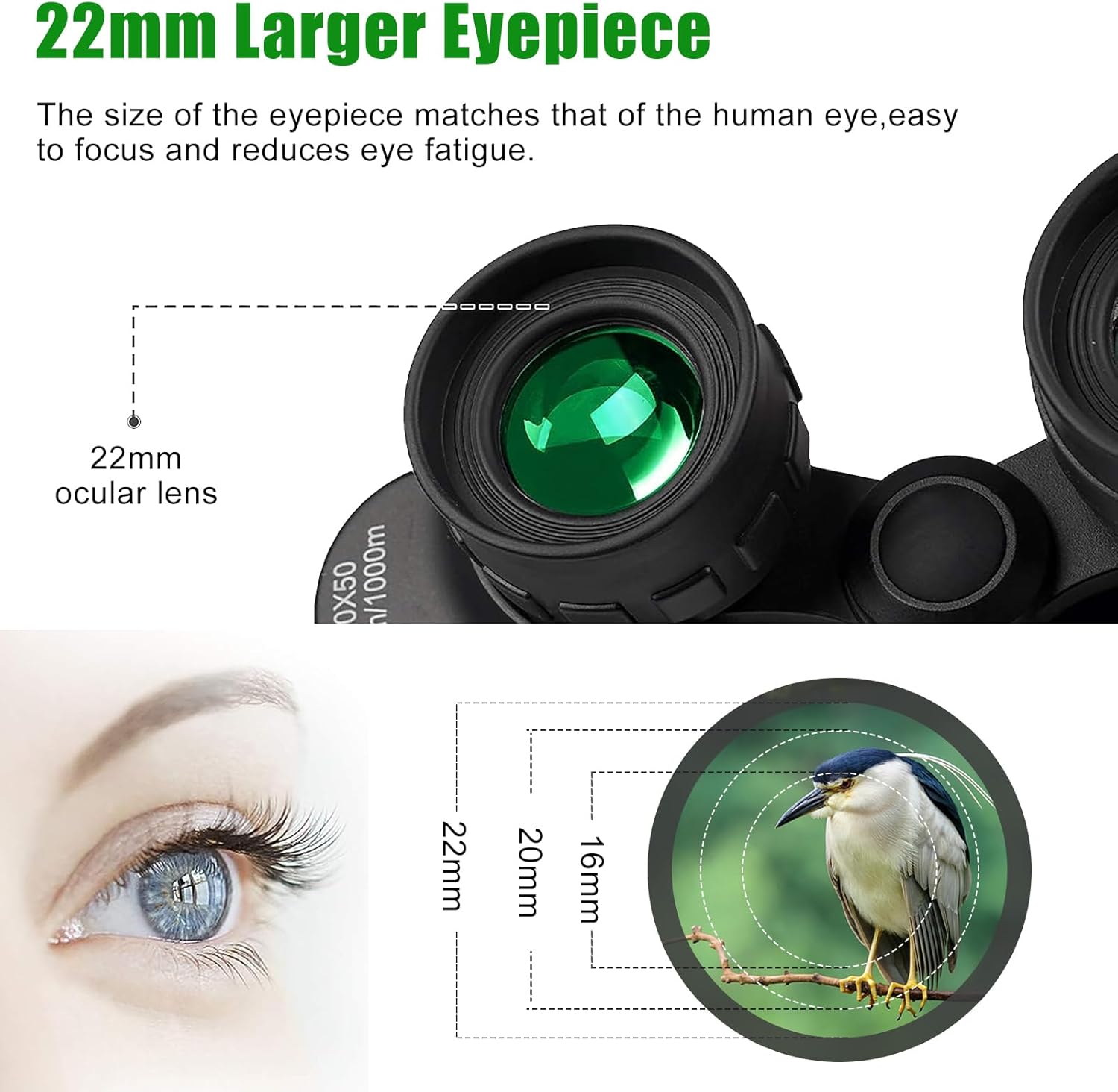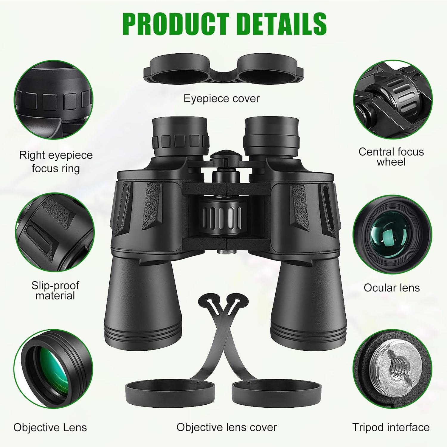 - 【Weites Sichtfeld】20x50 High Performance Fernglas sind 20x Vergrösserung, 22mm Okular mit einem weiten Sichtfeld, 56m Sichtfeld auf 1000m; 50mm Objektiv mit Premium-Klarheit und Helligkeit; entwickelt für Outdoor-Aktivitäten wie Wandern, Trekking,