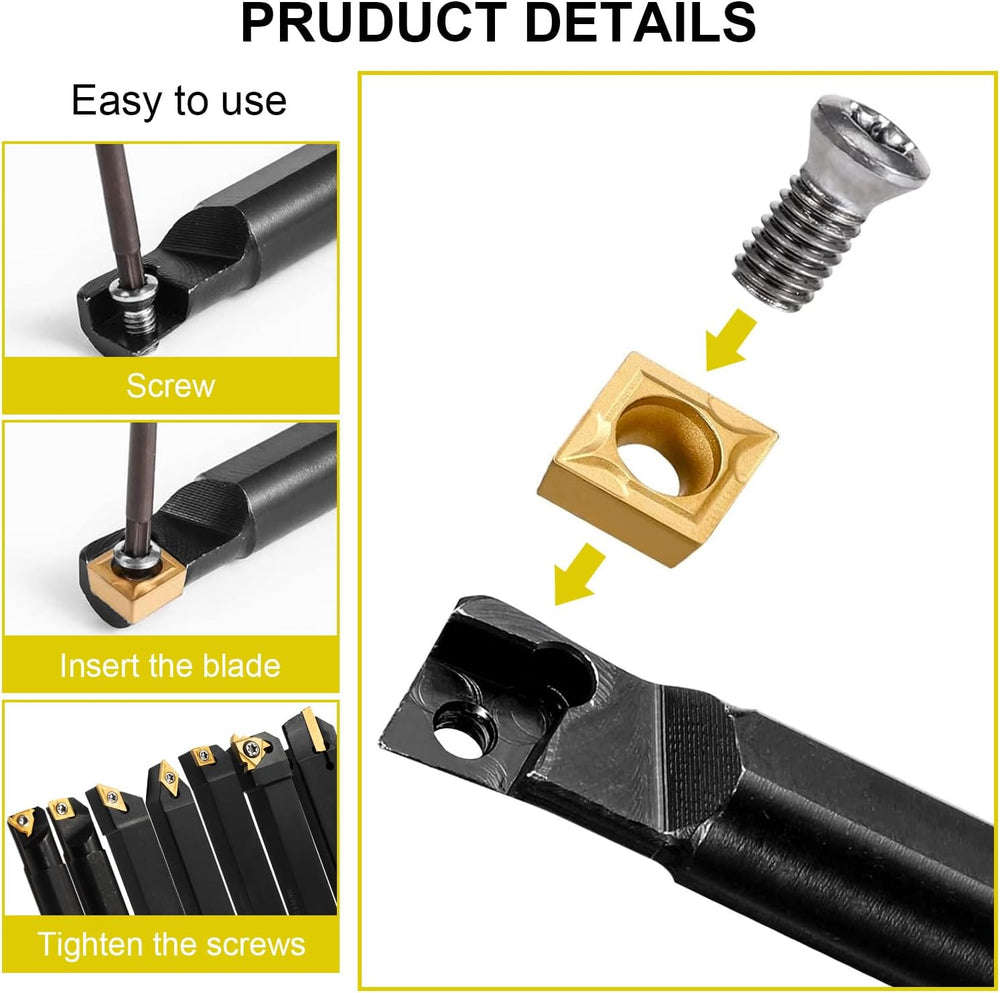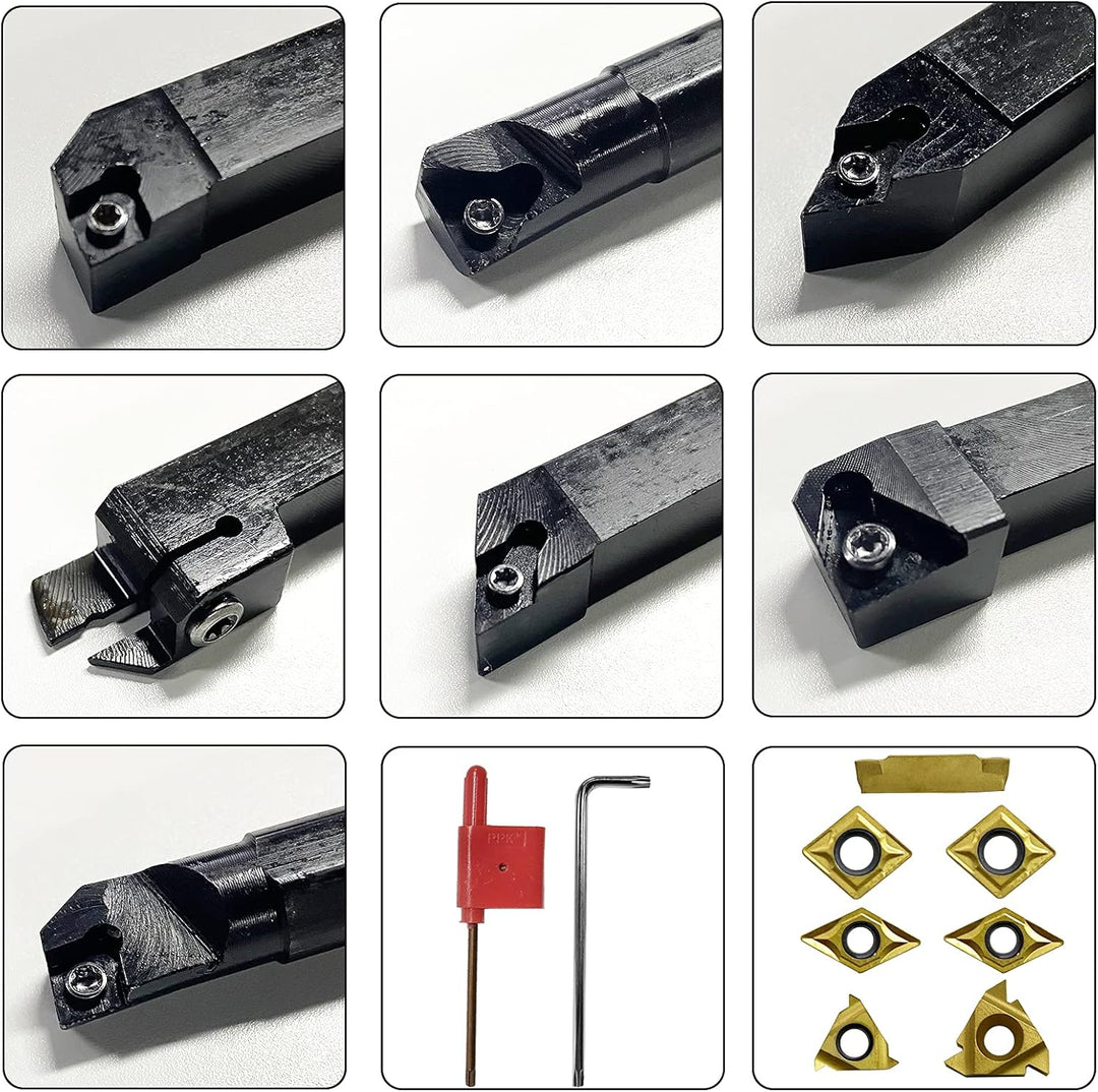 - Lieferumfang: 21pcs 12mm Drehwerkzeughalter Set inhalt --7 Stk.12mm Schaft-Bohrstangenhalter + 7 Stk. Hartmetall-Wendeschneidplatten+ 7 Stk. T8 Schraubenschlüssel.