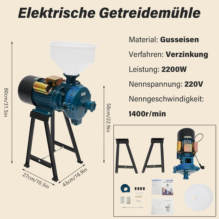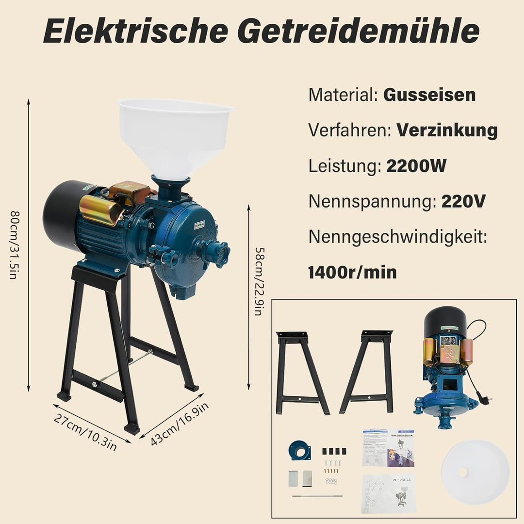 2200W 220V Getreidemühle, Getreidemühle Elektrisch, Getreidemühle Mühle Nussmühle mit Trichter, Komm