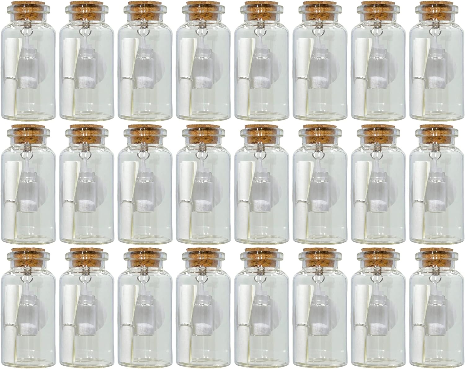 • Jede der 24 kleinen Flaschen hat einen Korken, einen Innenanhänger mit Glitzer befüllt, zwei gerollten Blanko-Zettel.