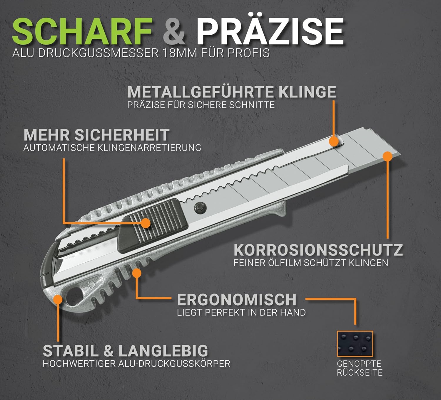 • Eigenschaften: Der Korpus besteht aus robustem Aluminium | Gummierter Griffrücken gewährt sicheren Schutz während der Anwendung | Durch die Arretierung ist das Cuttermesser Aluminium individuell einstellbar