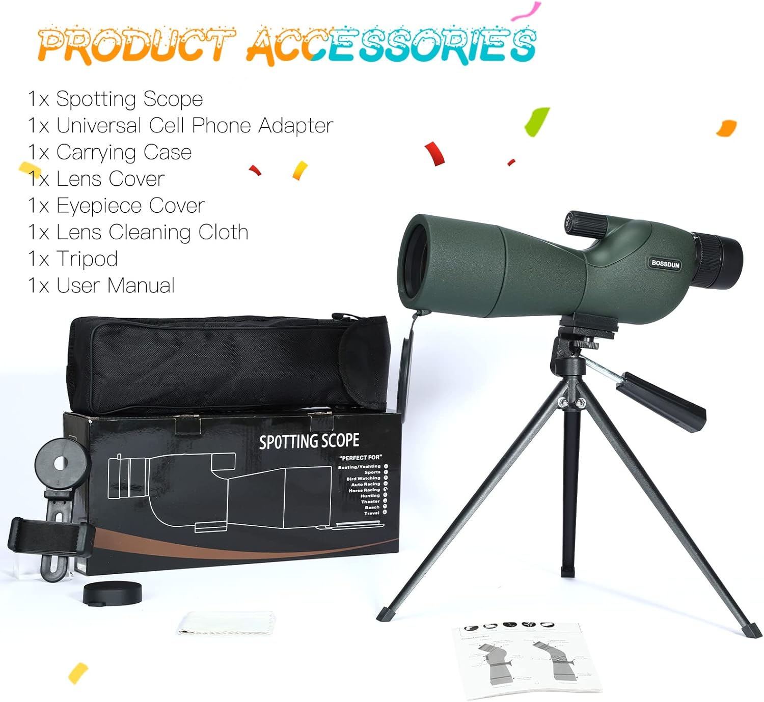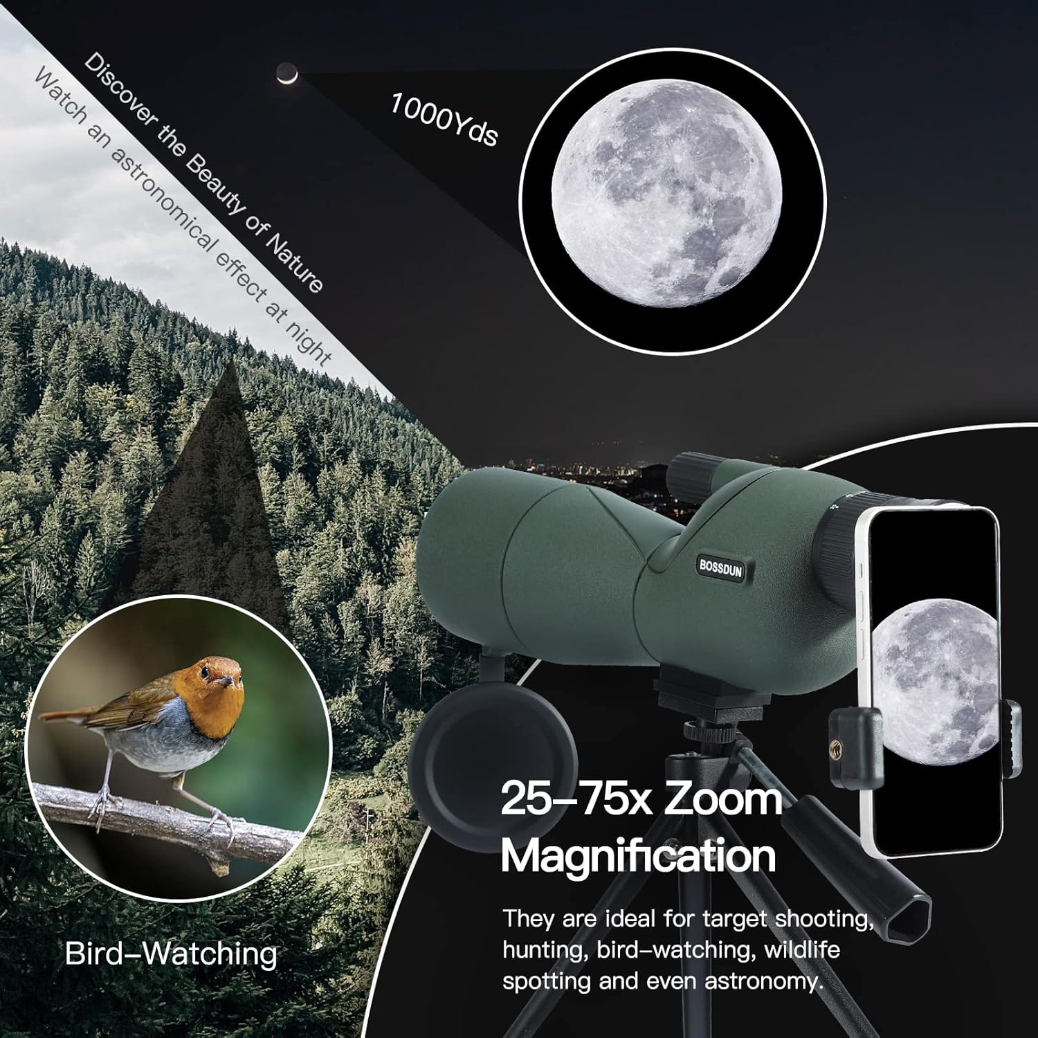 - ✅ Grenzenlose Zoom-Fähigkeit: Treten Sie ein in die Welt des BOSSDUN 25-75X60 Spektivs - Ihr Tor zur vielseitigen Erkundung. Mit einem variablen Vergrösserungsbereich von 25- bis 75-fach und einer leistungsstarken 60-mm-Objektivlinse können Sie