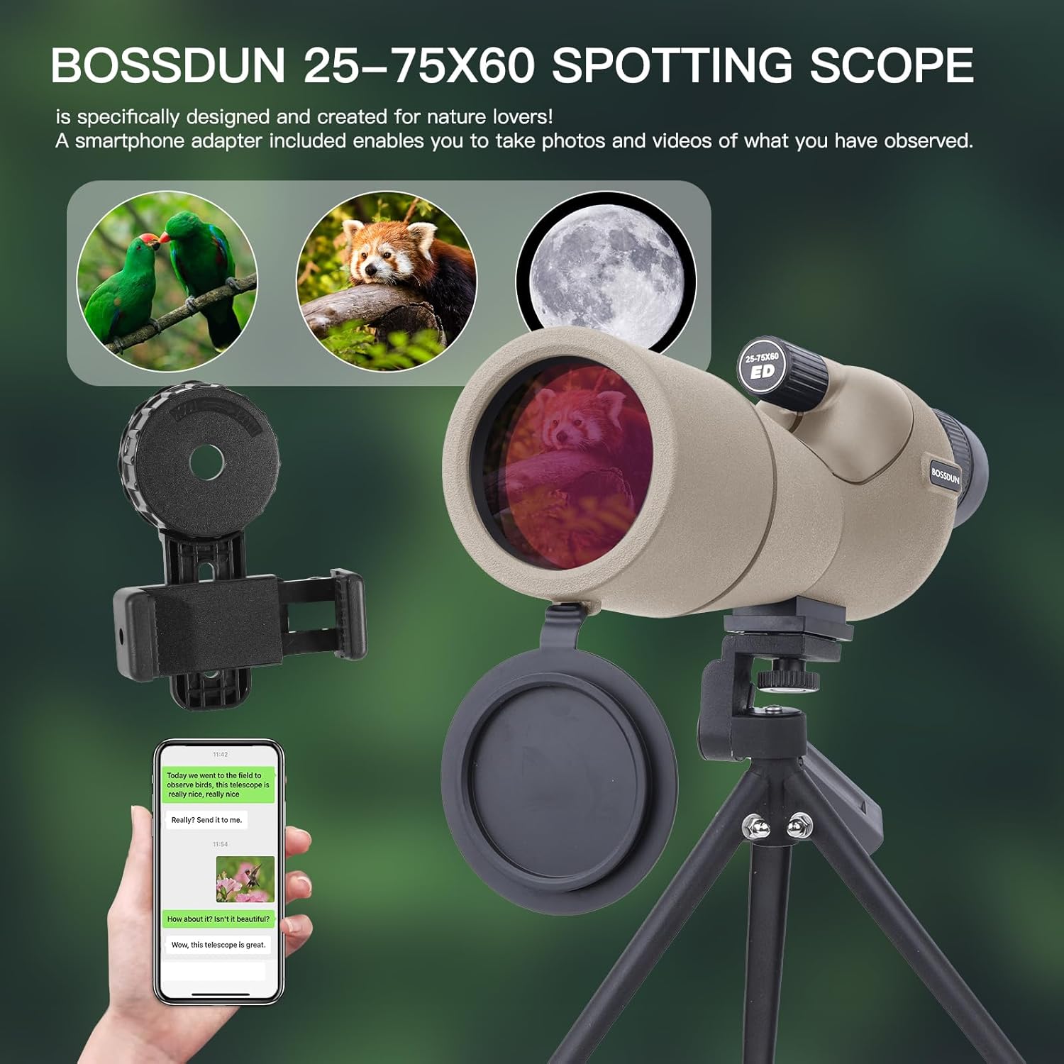 - ✅ Grenzenlose Zoom-Fähigkeit: Treten Sie ein in die Welt des BOSSDUN 25-75X60 Spektivs - Ihr Tor zur vielseitigen Erkundung. Mit einem variablen Vergrösserungsbereich von 25- bis 75-fach und einer leistungsstarken 60-mm-Objektivlinse können Sie
