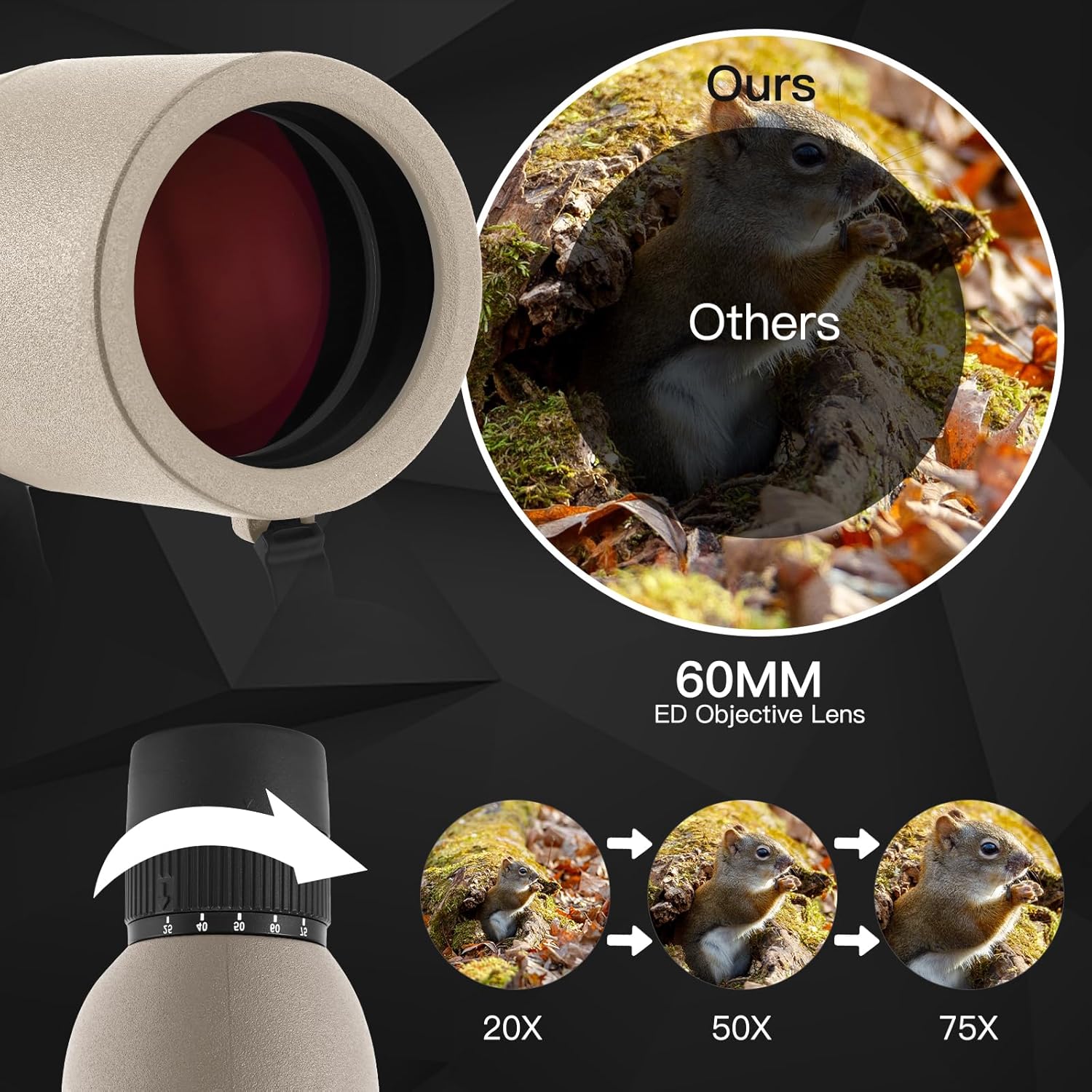 - ✅ Brillanz auch bei schlechten Lichtverhältnissen: Ausgestattet mit einer FMC (fully multi-coated) 60mm Objektivlinse, garantiert unser Spektiv eine einwandfreie Sicht. Mit einem Sehfeld von 82,9 bis 48ft/1000yards, kombiniert mit der hochwertigen