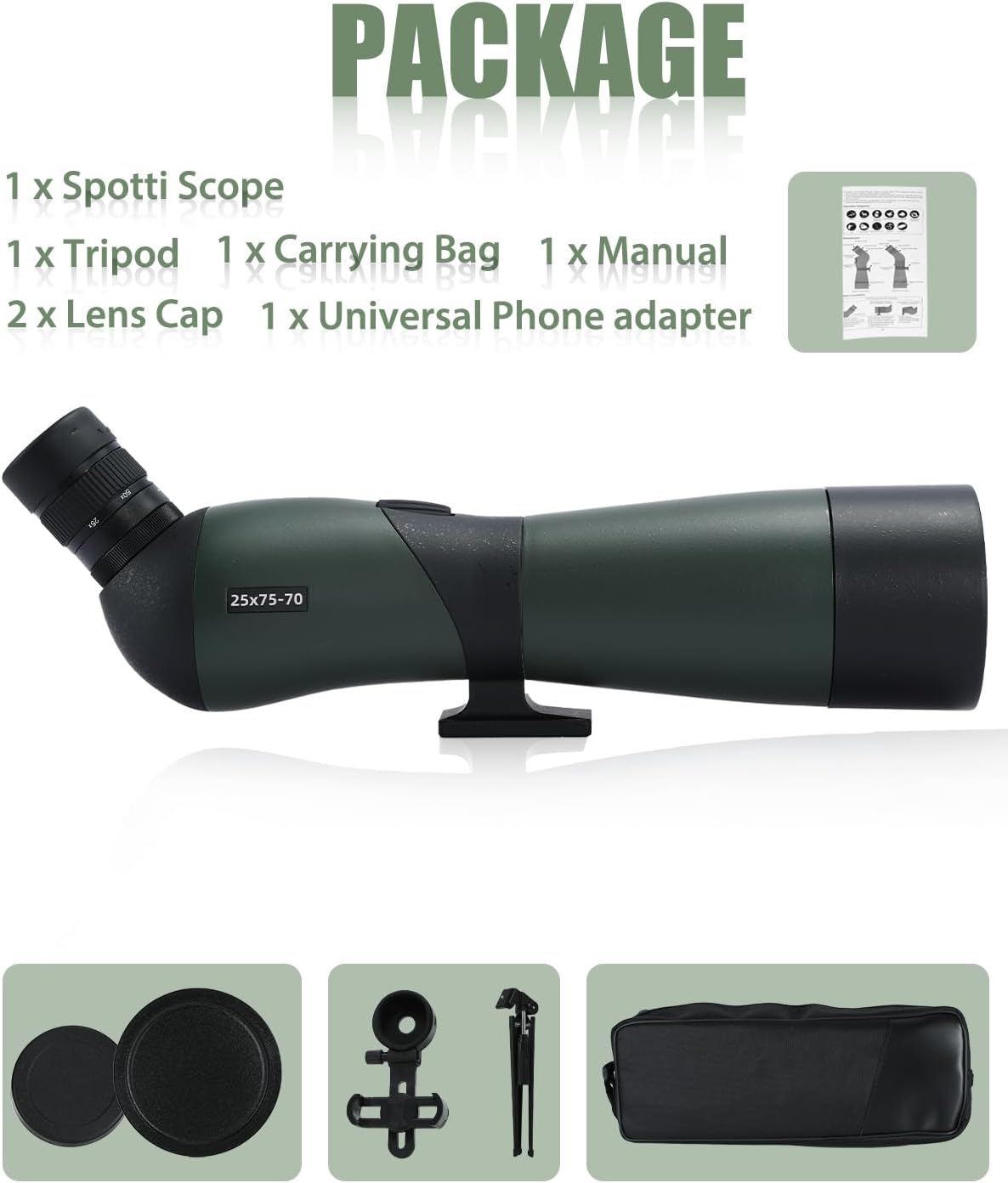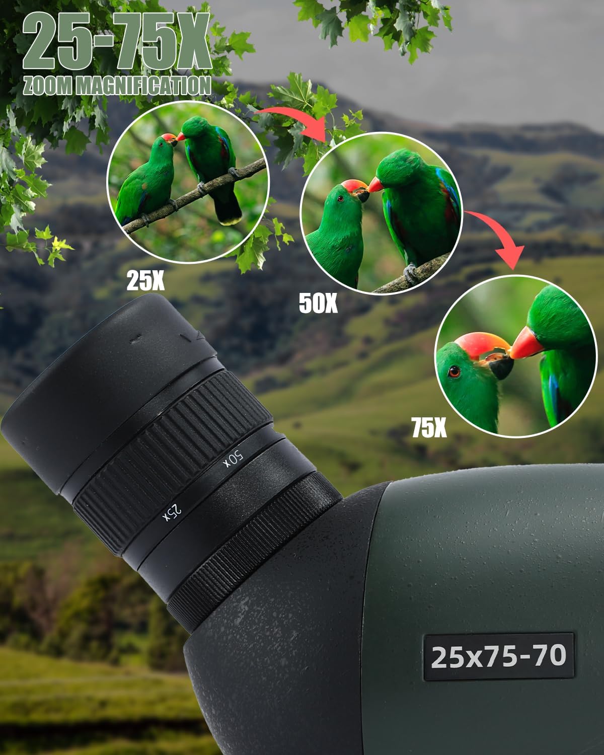 - 【25-75X Zoom Fleckenbereiche】 Mit dem leistungsstarken Zoom-Vergrösserungsbereich von 25x bis 75x können Sie ein breites Sichtfeld in einer niedrigeren Leistung anzeigen und auf Details mit einer höheren Leistung vergrössern. 45 Grad