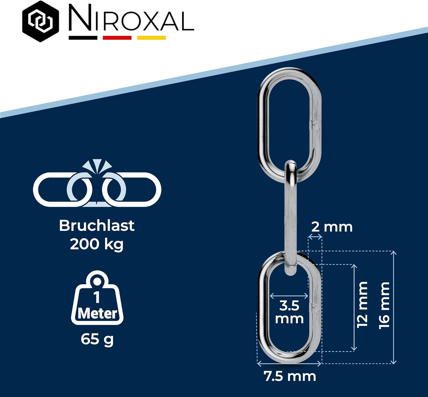 - Drahtstärke: 2 mm | Kettenglieder Länge Aussen: 16 mm | Kettenglieder Länge Innen: 12 mm | Kettenglieder Breite Aussen: 7,5 mm | Kettenglieder Breite Innen: 3,5 mm | Bruchlast: 200 kg | Gewicht pro Meter Kette: 65 g