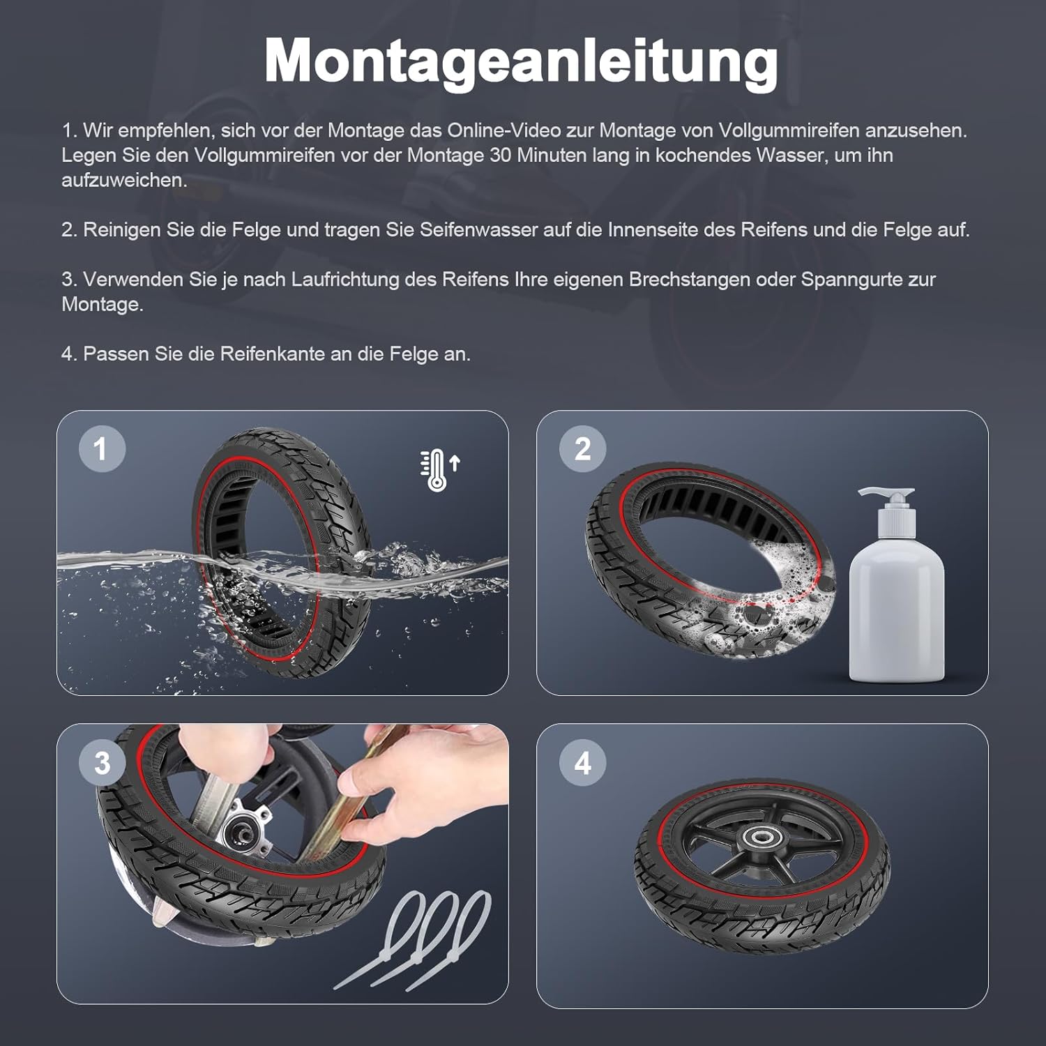 - [Bitte vor der Installation Erweichen] - Wir empfehlen, die Vollreifen vor der Installation 30 Minuten lang in kochendes Wasser oder einen Mikrowellenherd zu legen, um sie weich zu machen. Das Modifizieren von Reifen erfordert Geschick, und Sie können