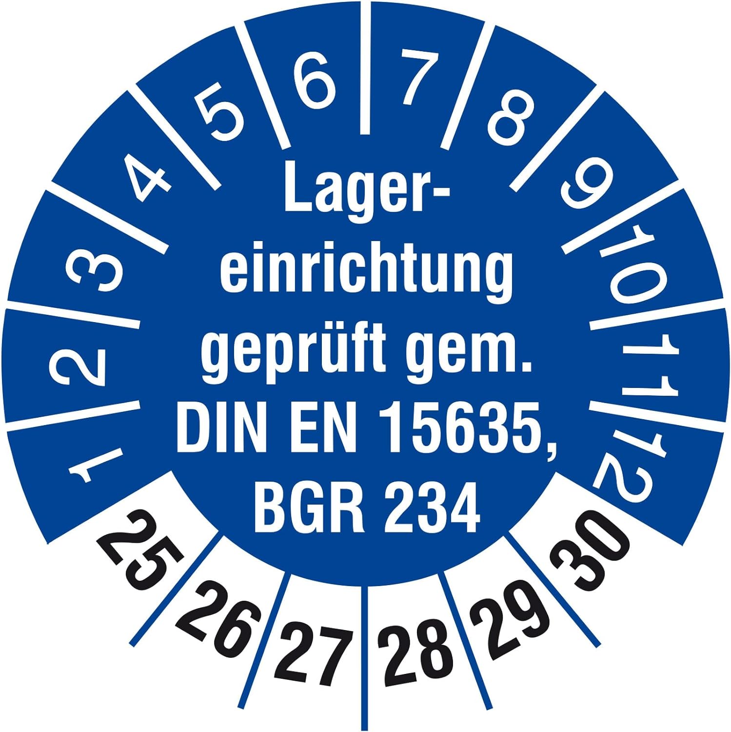 2500 Prüfetiketten 30 mm Lagereinrichtung geprüft DIN EN 15635 BGR 234 2025-2030 Prüfplaketten 2500
