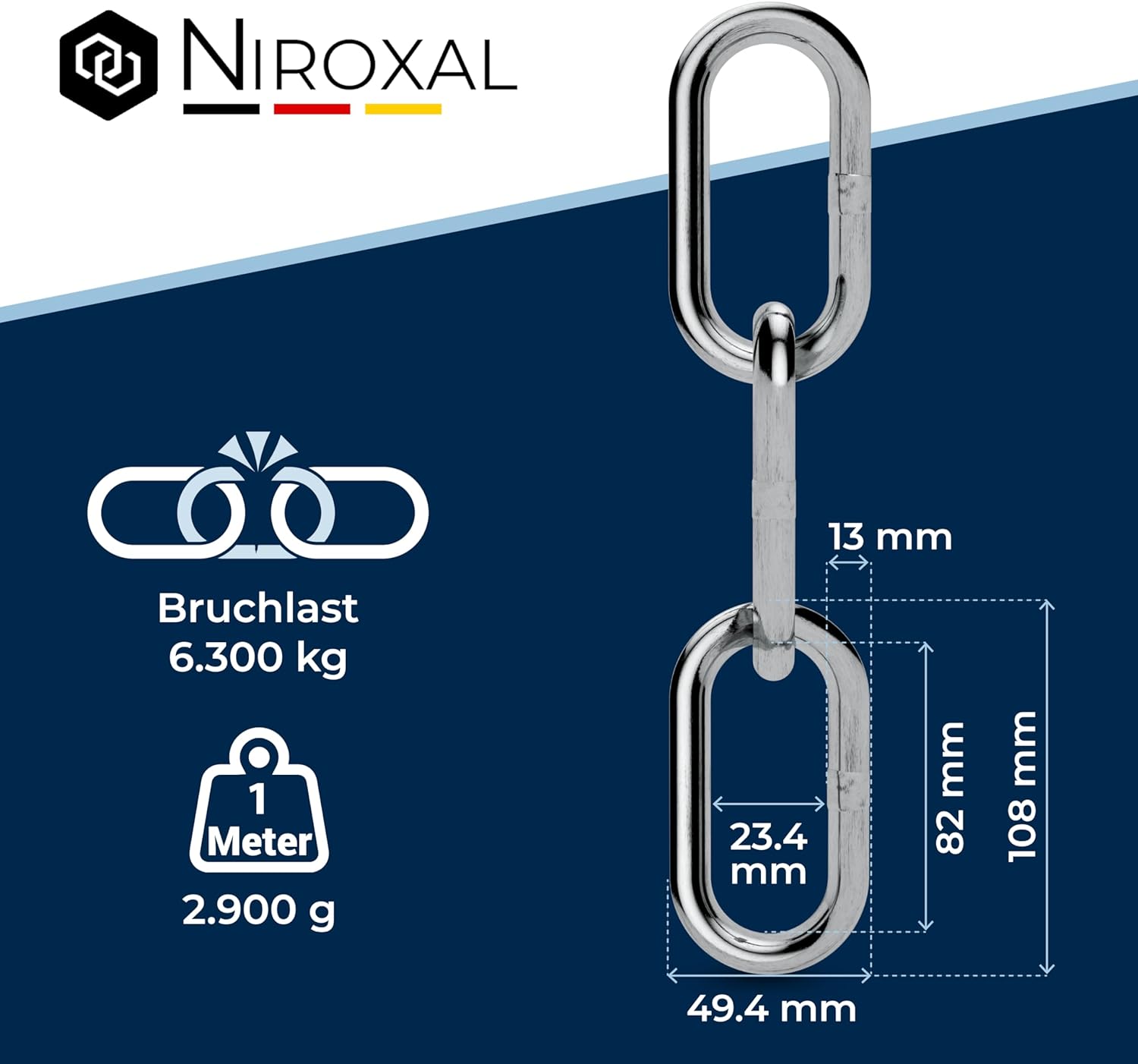 - Drahtstärke: 13 mm | Kettenglieder Länge Aussen: 108 mm | Kettenglieder Länge Innen: 82 mm | Kettenglied Breite Aussen: 52 mm | Kettenglied Breite Innen: 26 mm | Bruchlast: 6.300 kg | Gewicht pro Meter Kette Edelstahl Meterware: 2.900 g/Meter