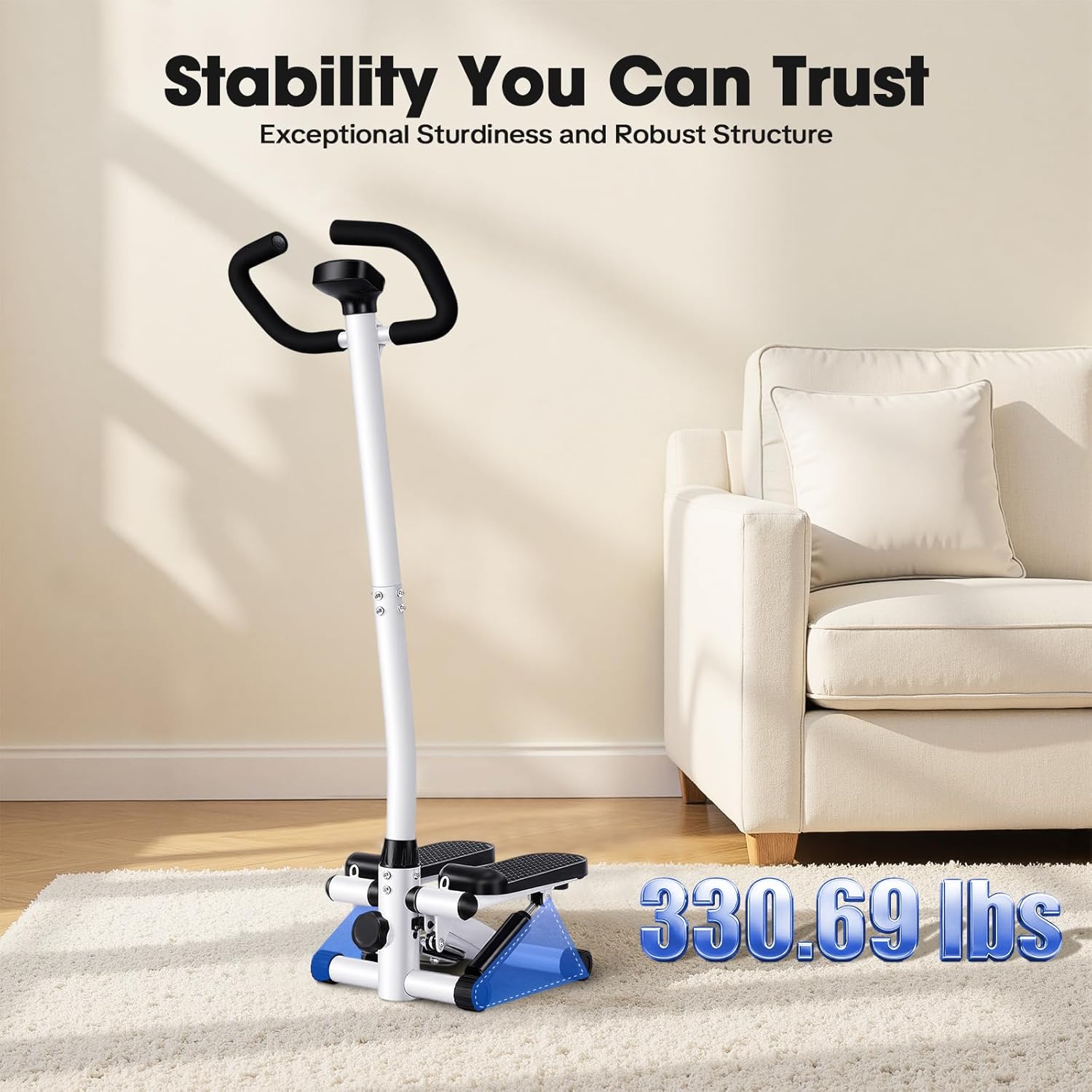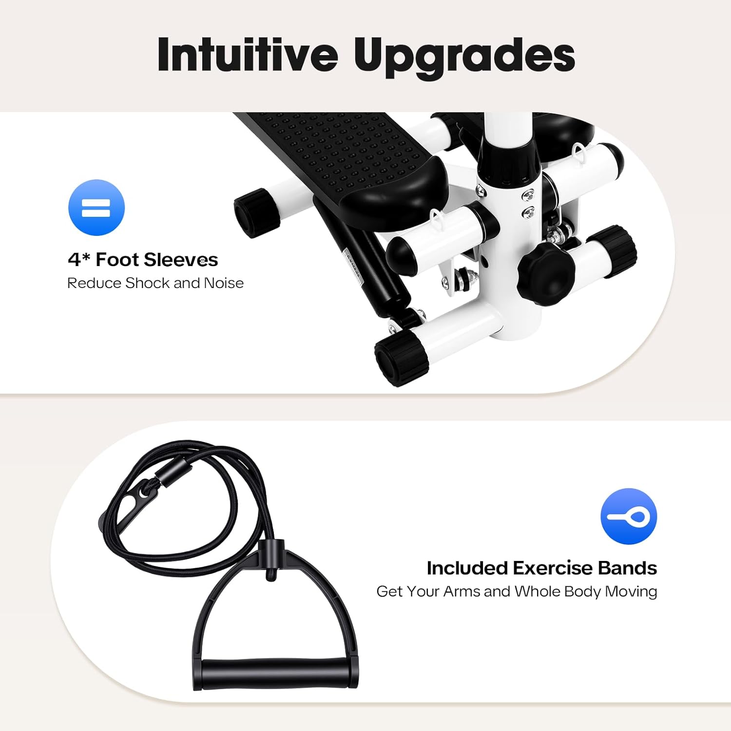 - Er benötigt lediglich eine Stellfläche von 0,11 m², was ihn zu einem idealen Hometrainer-Stepper für kleinere Räume macht