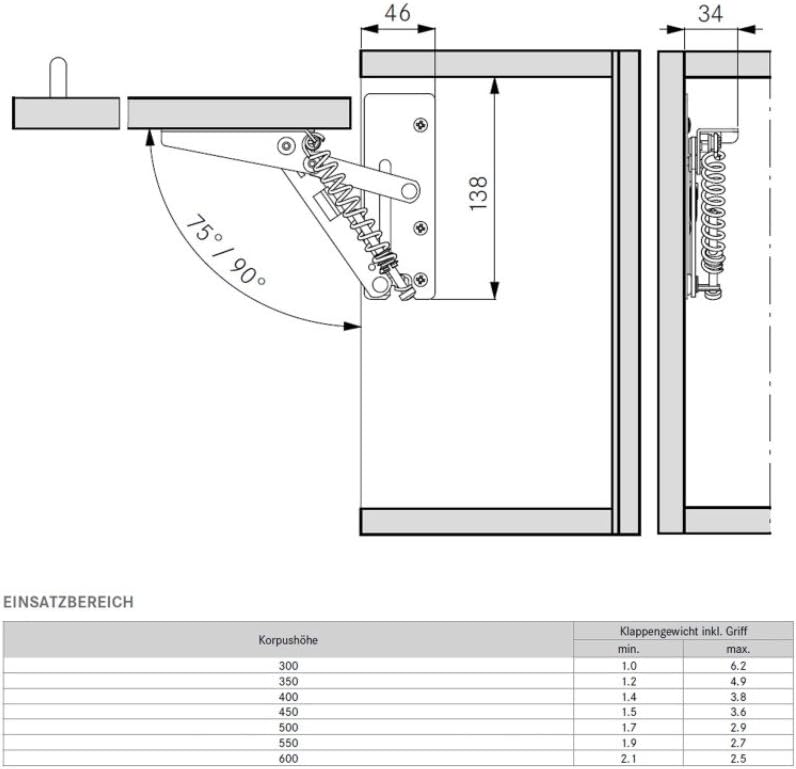 - Öffnungswinkel einstellbar auf 75 oder 90° / Klappenbreite: bis 1200 mm, Höhe: 300 - 600 mm