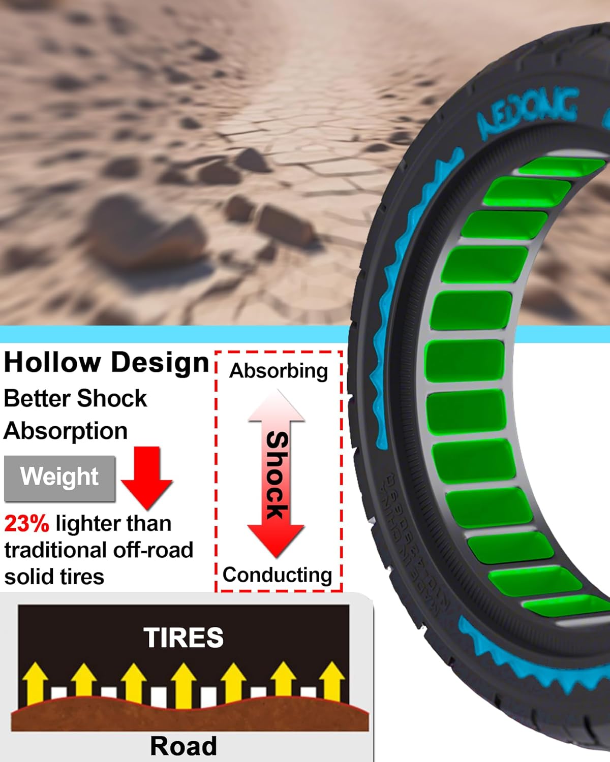 - Schockabsorbierung: Die präzisionsgefertigte 9.5x2.5-6.1 Wabenstruktur absorbiert Pannen, indem sie Stösse über mehr als 120 sechseckige Zellen verteilt, während das schlauchlose Design den Reifen ohne Luft fest an der Nabe hält