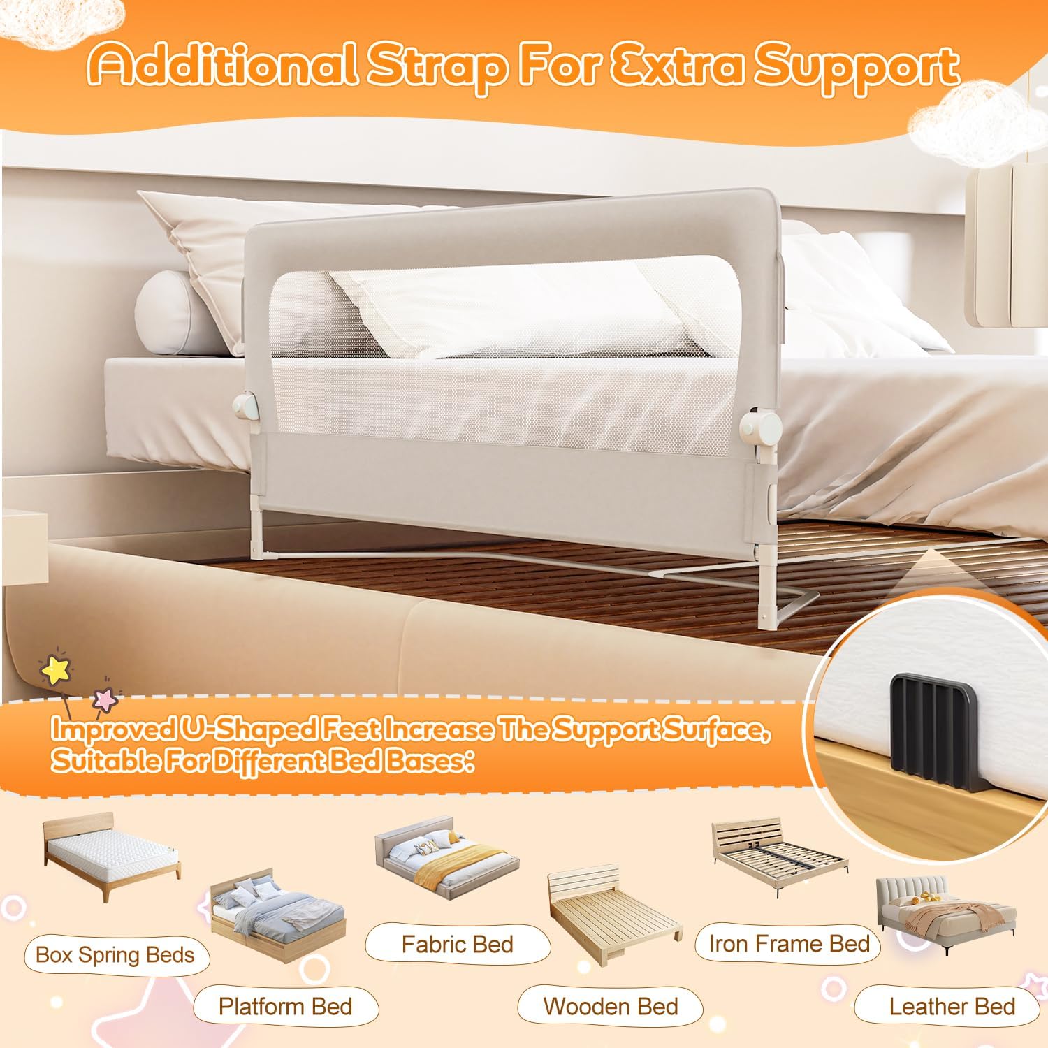 - Rutschfeste Haltegurte: Jedes Bettgitter wird mit 2,2 m langen Y-förmigen Gurten geliefert, die für maximalen Halt sorgen. Passt zu verschiedenen Betttypen (Kinderbett, Doppelbett, Holzbett).
