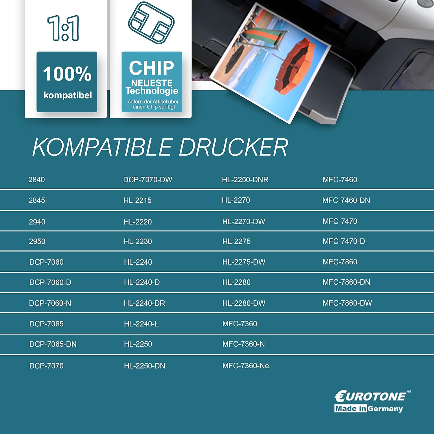 - Kompatibel zu Brother DCP 7060 (D / N), DCP 7065 (DN), DCP 7070 (DW), HL 2215, HL 2220, HL 2230, HL 2240 (D / DR / L), HL 2250 (DN / DNR), HL 2270 (DW), HL 2275 (DW), HL 2280 (DW), MFC 7360 (N / Ne), MFC 7460 (DN), MFC 7470 (D), MFC 7860 (DN / DW), Fax: