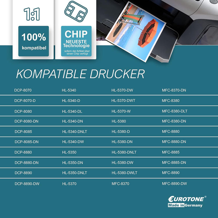 - Kompatibel zu Brother DCP 8070 (D), DCP 8080 (DN), DCP 8085 (DN), DCP 8880 (DN), DCP 8890 (DW), HL 5340 (D / DL / DN / DN / DNLT / DW), HL 5350 (DN / DN / DNLT), HL 5370 (DW / DWT / W), HL 5380 (D / DN / DN / DNLT / DW / DWLT), MFC 8370 (DN), MFC 8380