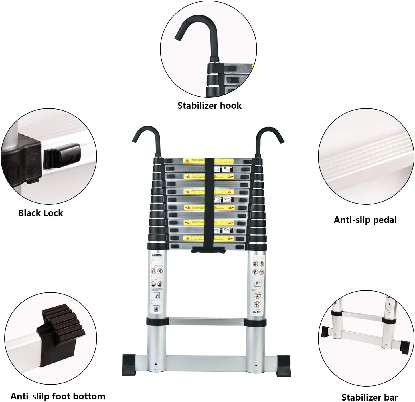 • Sicherheit: Stabilisatorstange und rutschfeste Unterlage verbessern die Stabilität der Leiter, sodass Sie sich keine Sorgen mehr machen müssen, wenn Sie die Leiter verwenden. Diese Teleskopleiter mit Sicherheitsverriegelungsstufen und