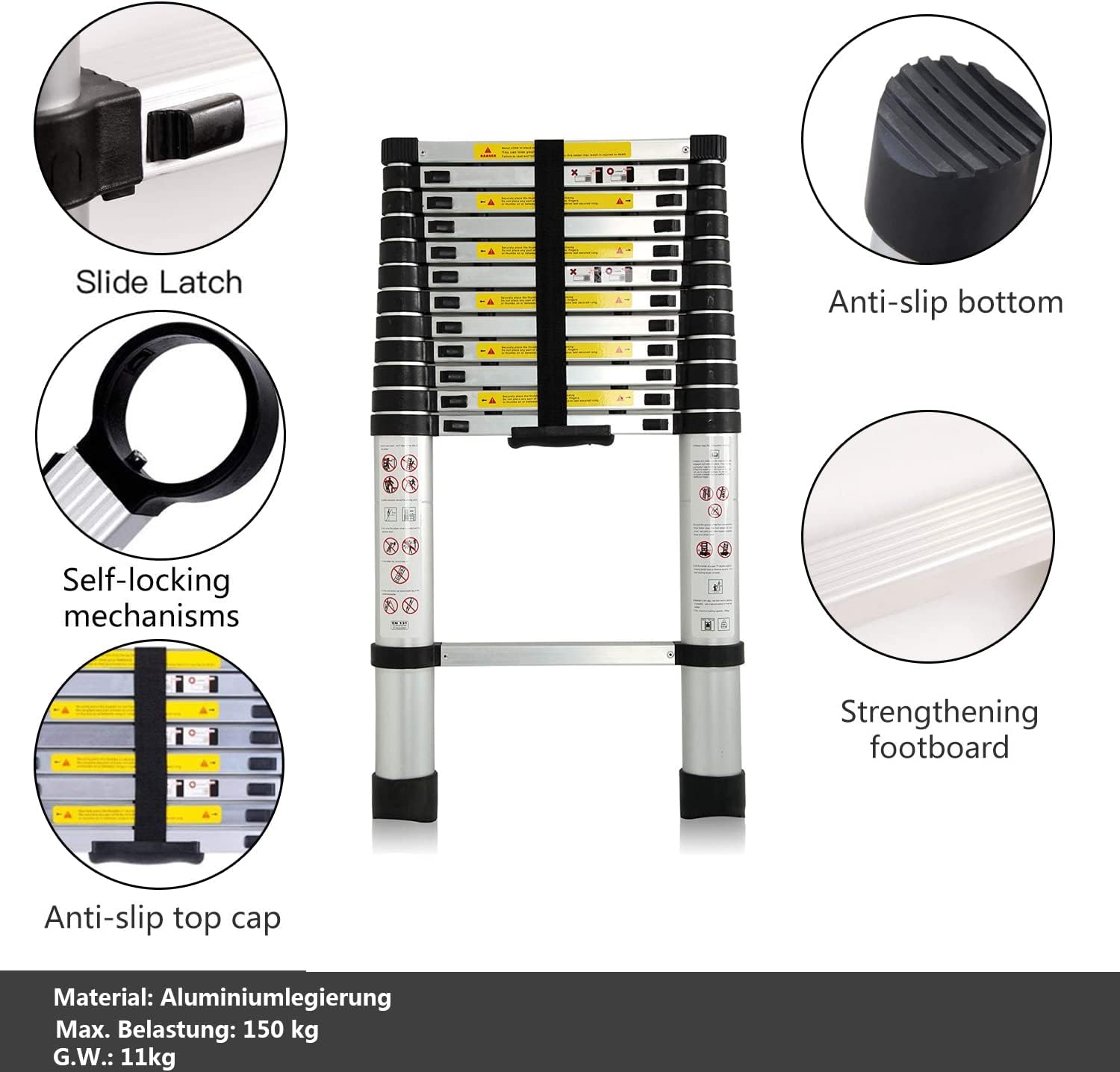 • TELESKOPLEITER: 3,8m ausziehbare Teleskopleiter mit 13 Stufen, maximale Belastung bis zu 150 kg. Auf der vollen Länge von 3,8 m (12,5 Fuss) lässt sich diese Teleskopleiter auf ein Viertel ihrer Höhe zurückziehen, um sie in Ihrem Auto oder anderen