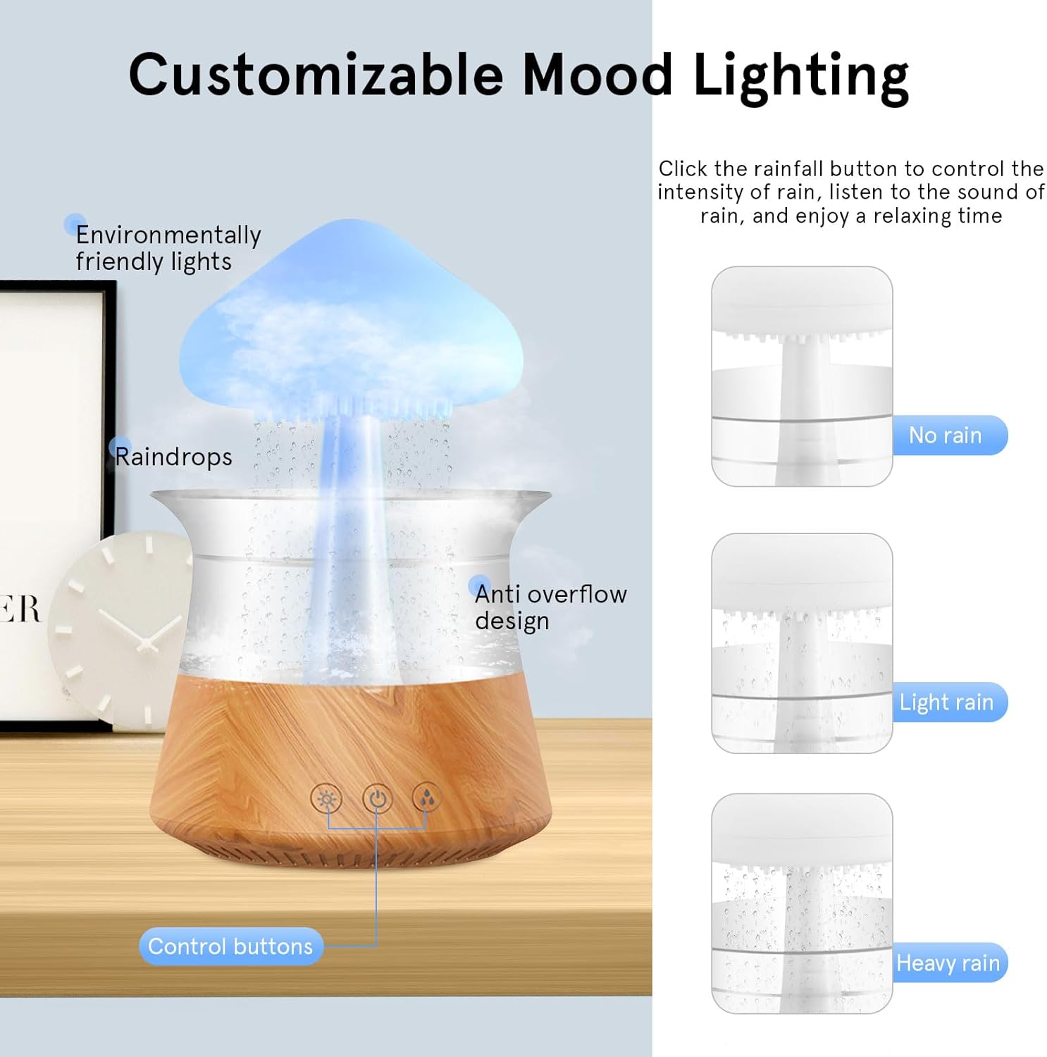 • ️ 【7 Farben-Nachtlichter】 Das Aromatherapie-Nachtlicht hat 7 LED-Farben, die Farbe und der Schalter werden durch Tasten gesteuert. Drücken Sie die rechte Taste rechts, um auch die Menge an Regen und Wasserspray einzustellen.
